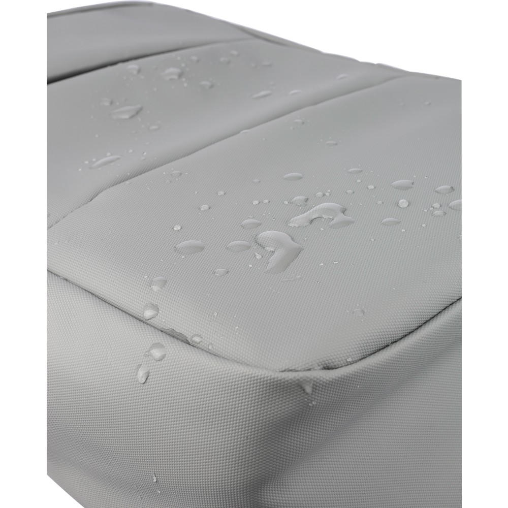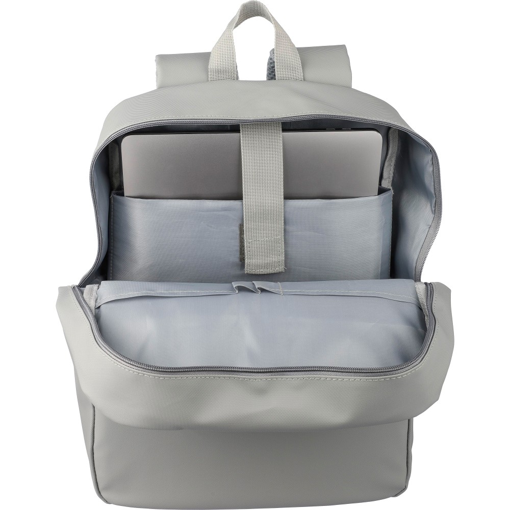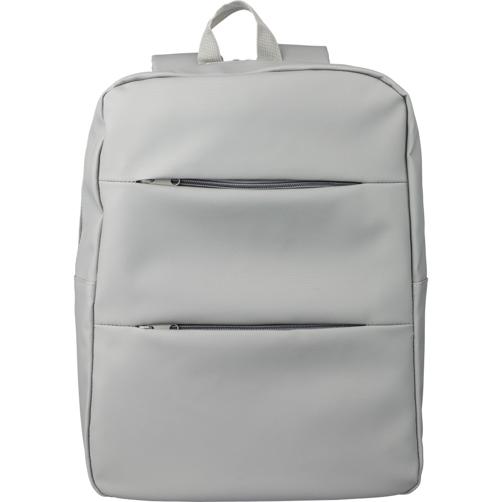 PU laptop backpack (15 inch) with two zippered front pockets, a large zippered compartment with a Velcro-closed laptop section, and multiple inserts inside. Ventilated padded backside with trolley strap and adjustable shoulder straps. Water repellent.