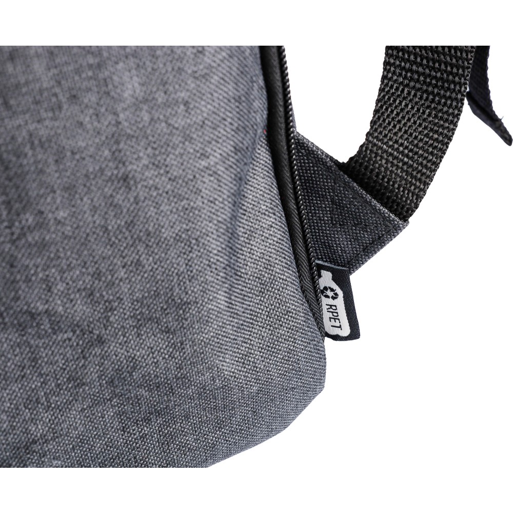 600D polyester canvas laptop backpack (15 inch) with PVC detail and 210D lining. Features a small zippered front pocket with a carabiner for keys, one zippered side compartment, one regular side pocket, and a large magnet-closed compartment with a laptop pocket. Push buttons on the side to close the backpack when not fully filled. Adjustable ventilated straps. Includes an rPET label on the front.