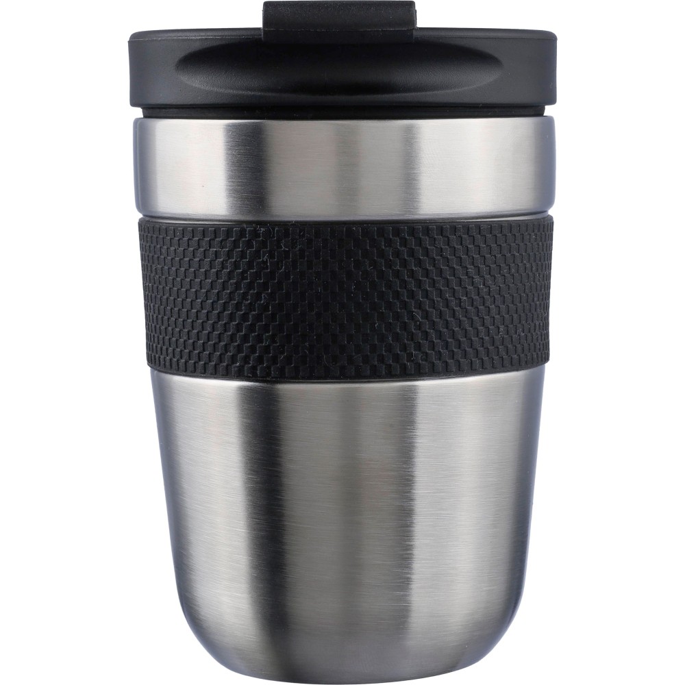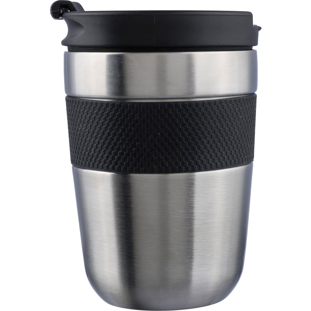 Stainless steel double-walled drinking mug (300 ml) with a PP lid and silicone grip. Keeps contents hot for 4 hours and cold for 6 hours. The interior is made of stainless steel 304, and the exterior is stainless steel 201. Individually packaged in a brown cardboard box.