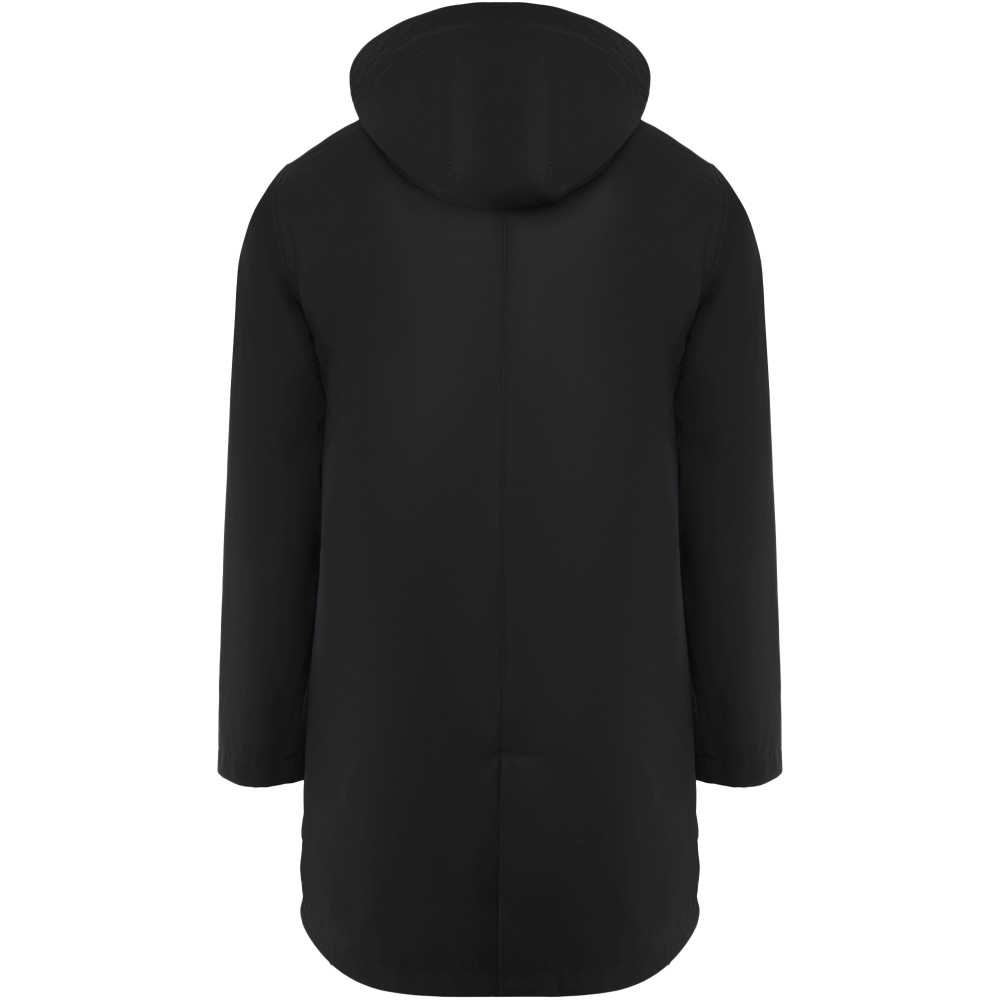 Waterproof raincoat. Hood with peak. Heat-sealed zips and seams. Contrasting details in black. Two side pockets with zip. Slit on back hem. Removable label. Waterproof. The model is 185 cm and is wearing size M. Polyurethaan of 100% Polyester, 210 g/m2.