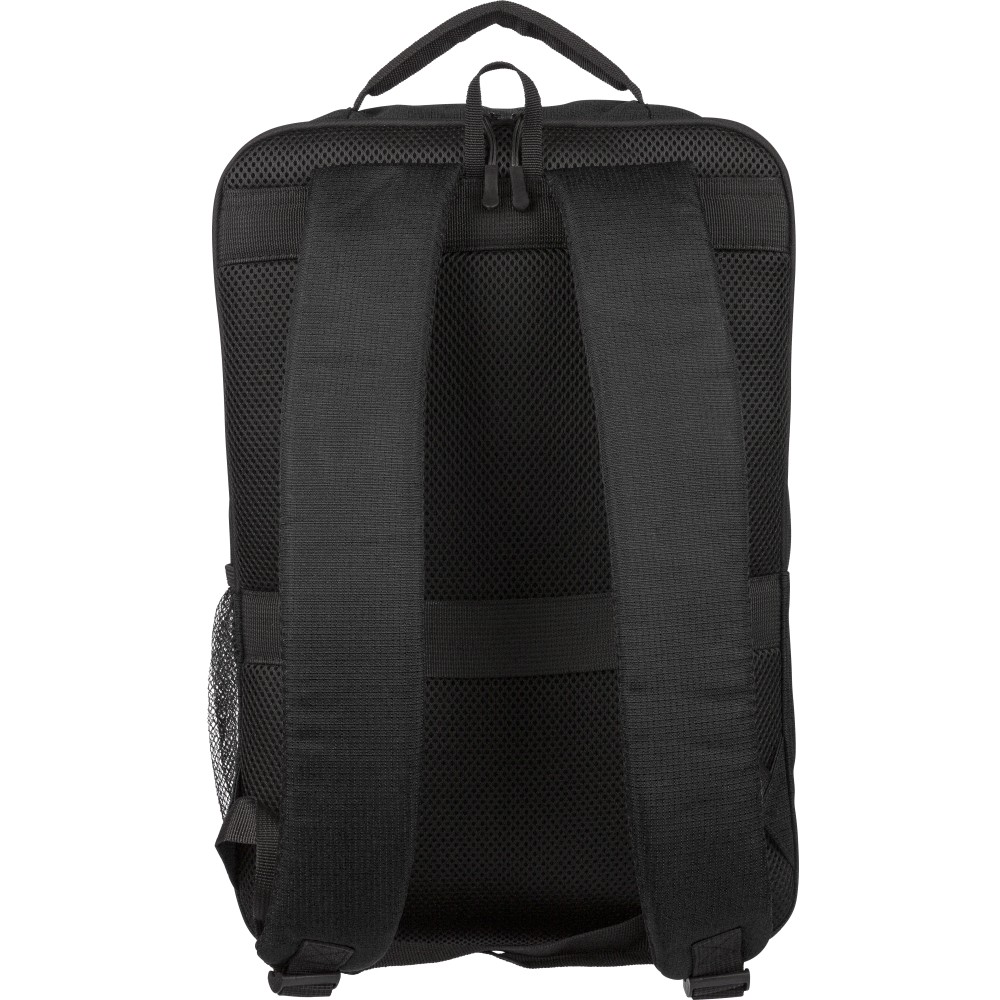 rPET 300D Ocean Bound backpack made from recycled ocean plastic with a durable, textured finish. 20 l capacity with two large zippered compartments, padded 15? laptop sleeve, two front pockets, mesh side pocket, and top loop. Features ventilated shoulder straps, padded back, trolley strap, and Ocean Bound Plastic label.