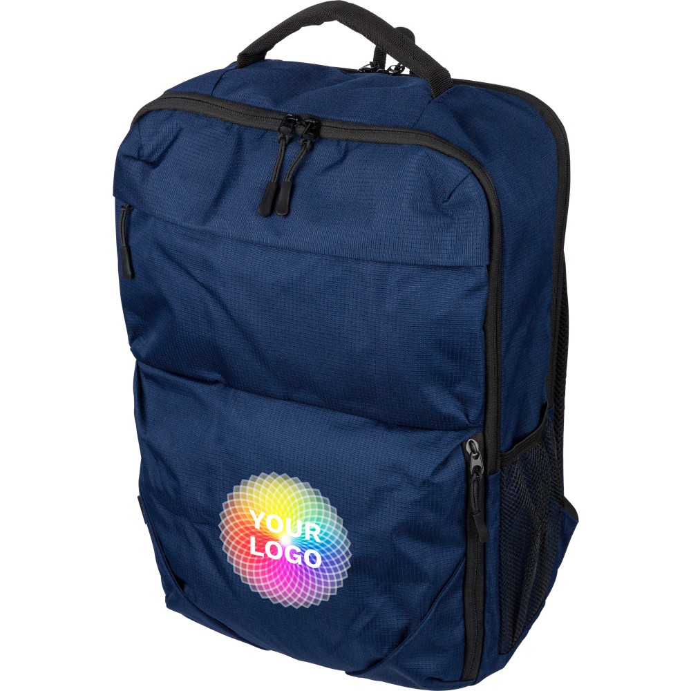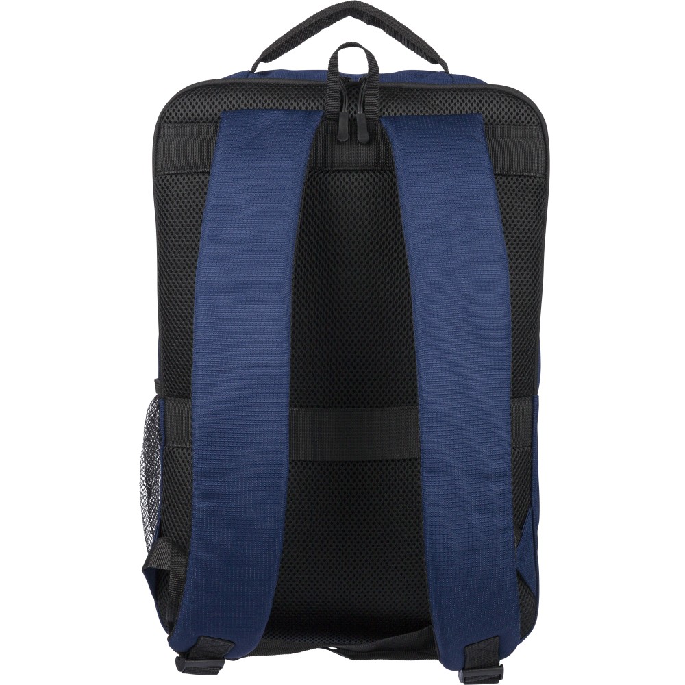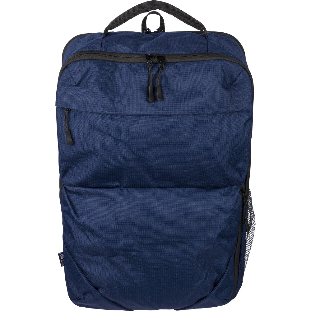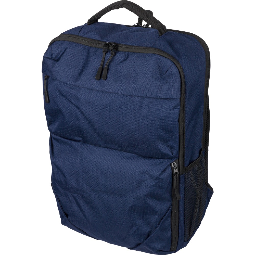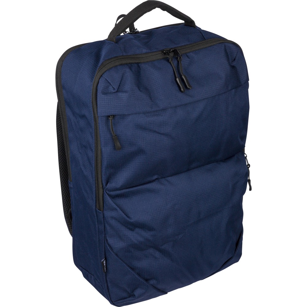 rPET 300D Ocean Bound backpack made from recycled ocean plastic with a durable, textured finish. 20 l capacity with two large zippered compartments, padded 15? laptop sleeve, two front pockets, mesh side pocket, and top loop. Features ventilated shoulder straps, padded back, trolley strap, and Ocean Bound Plastic label.