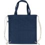 Recycled denim drawstring bag with size 40 x 38 cm. Features long handles of 2.5 x 50 cm and a pull cord for closing. Includes a recycled label on the outside and can be carried by shoulder straps or hand loop.