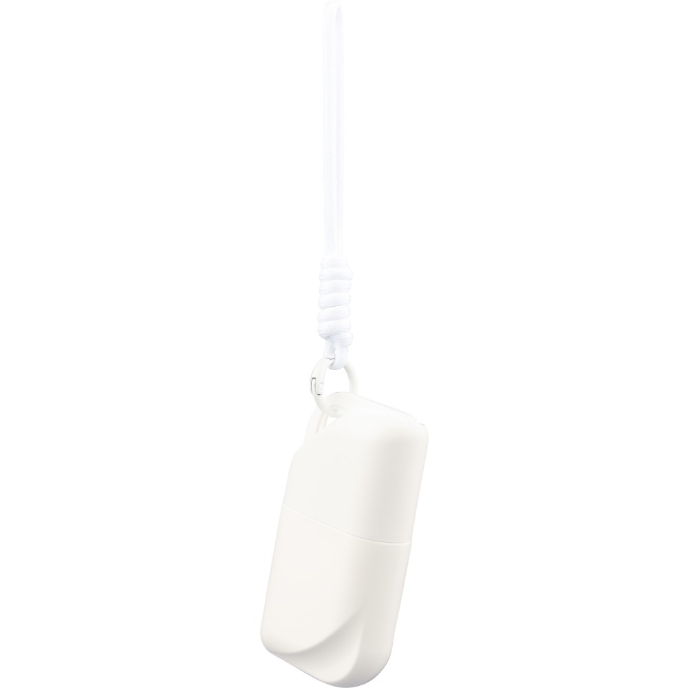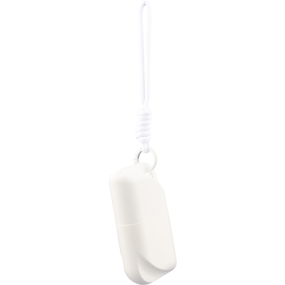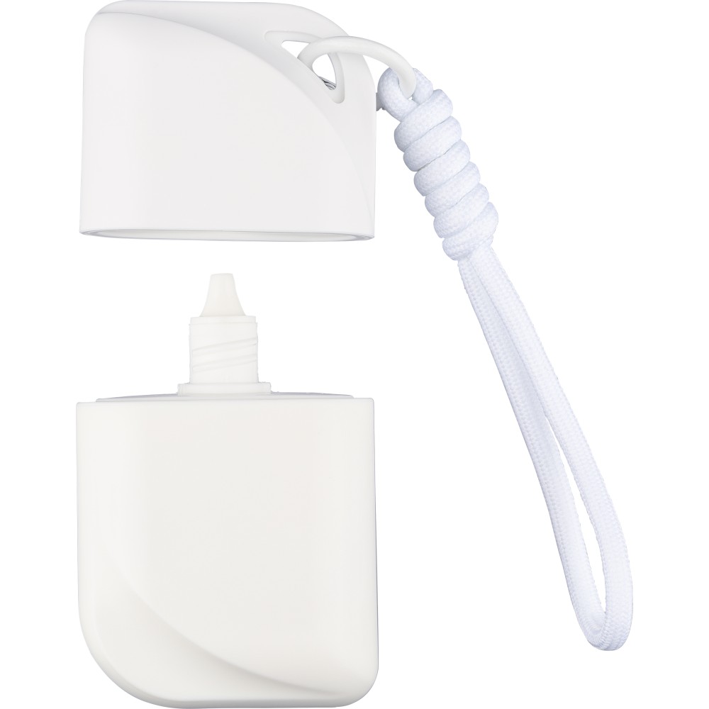 PP cassette with 50 ml sunscreen lotion (SPF50) and matching color polyester wrist cord with metal hook. Features a booklet sticker on the backside.