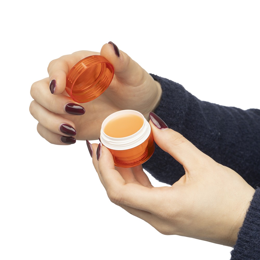 AS colored transparent jar with 12 g lip balm. The lip balm matches the color and is available in four flavors: vanilla (21), strawberry (08), orange (07) and blueberry (24).