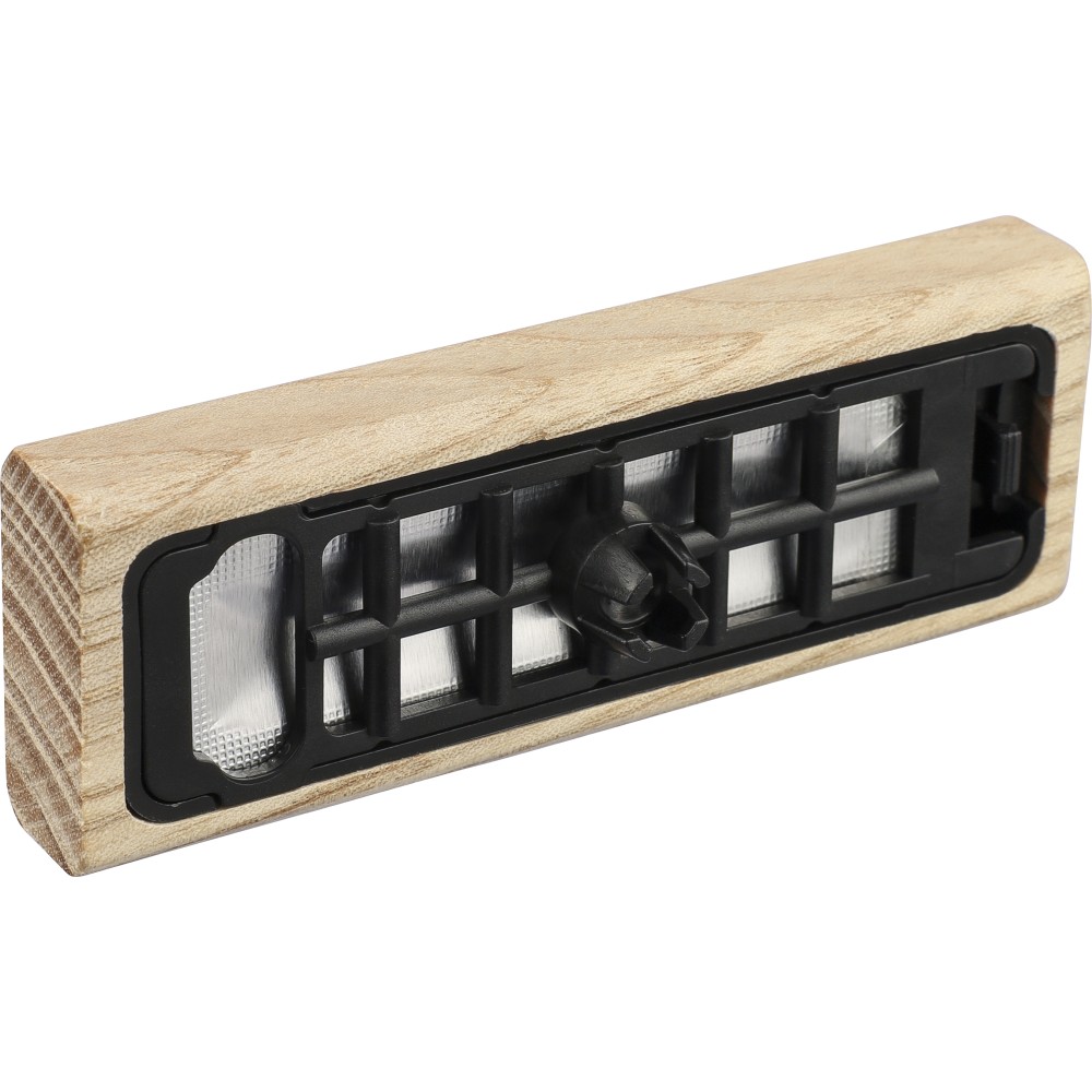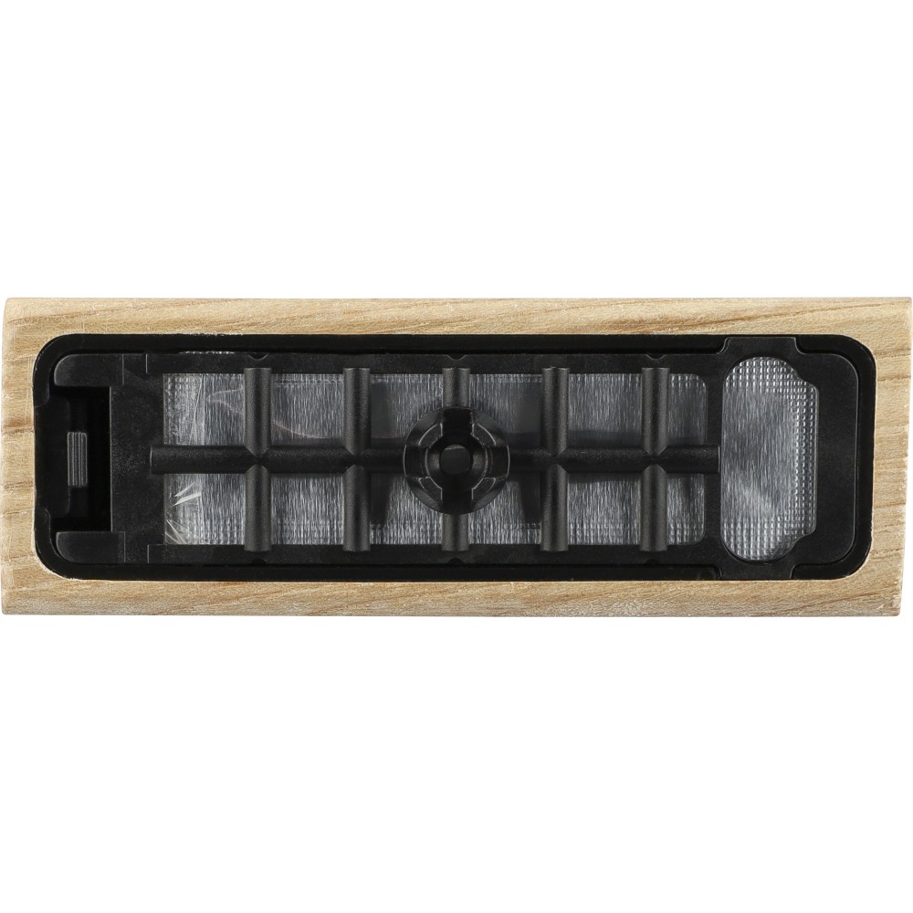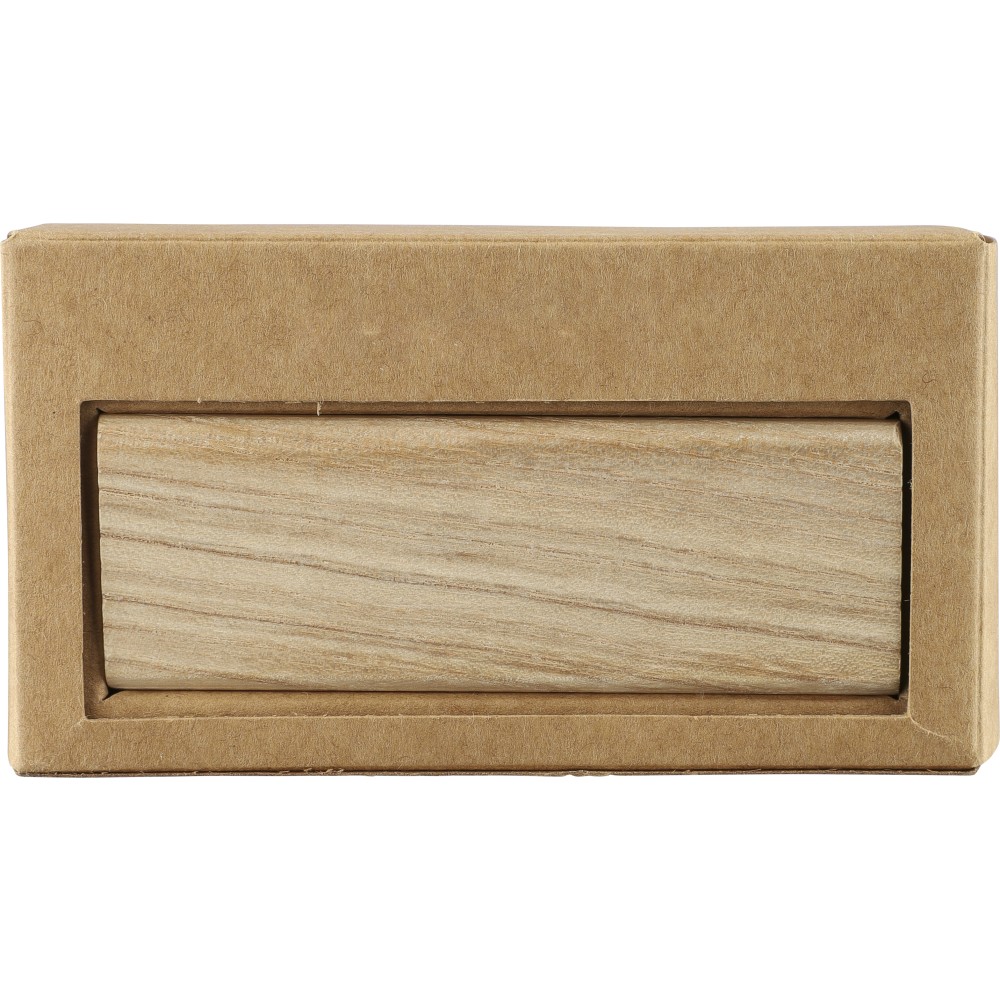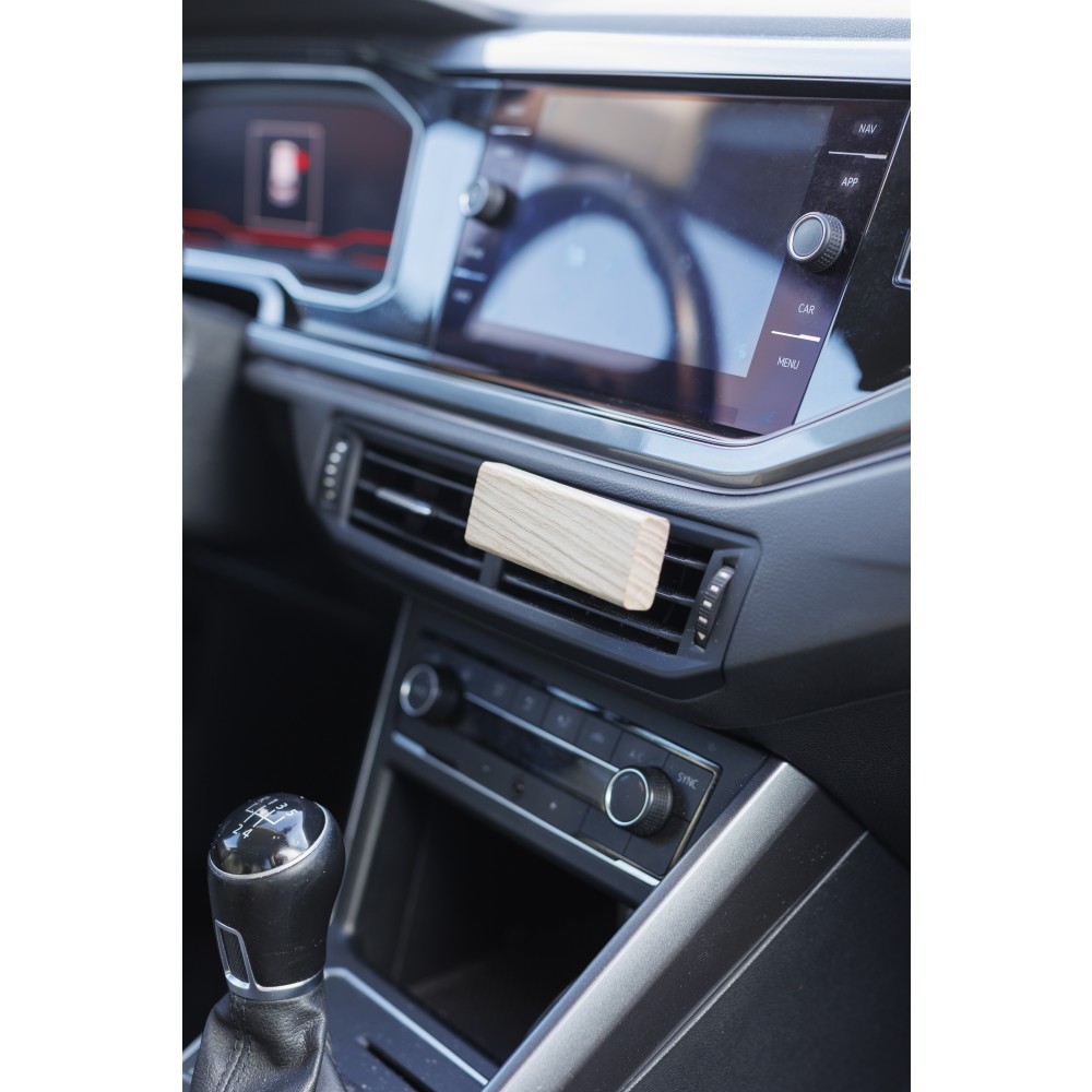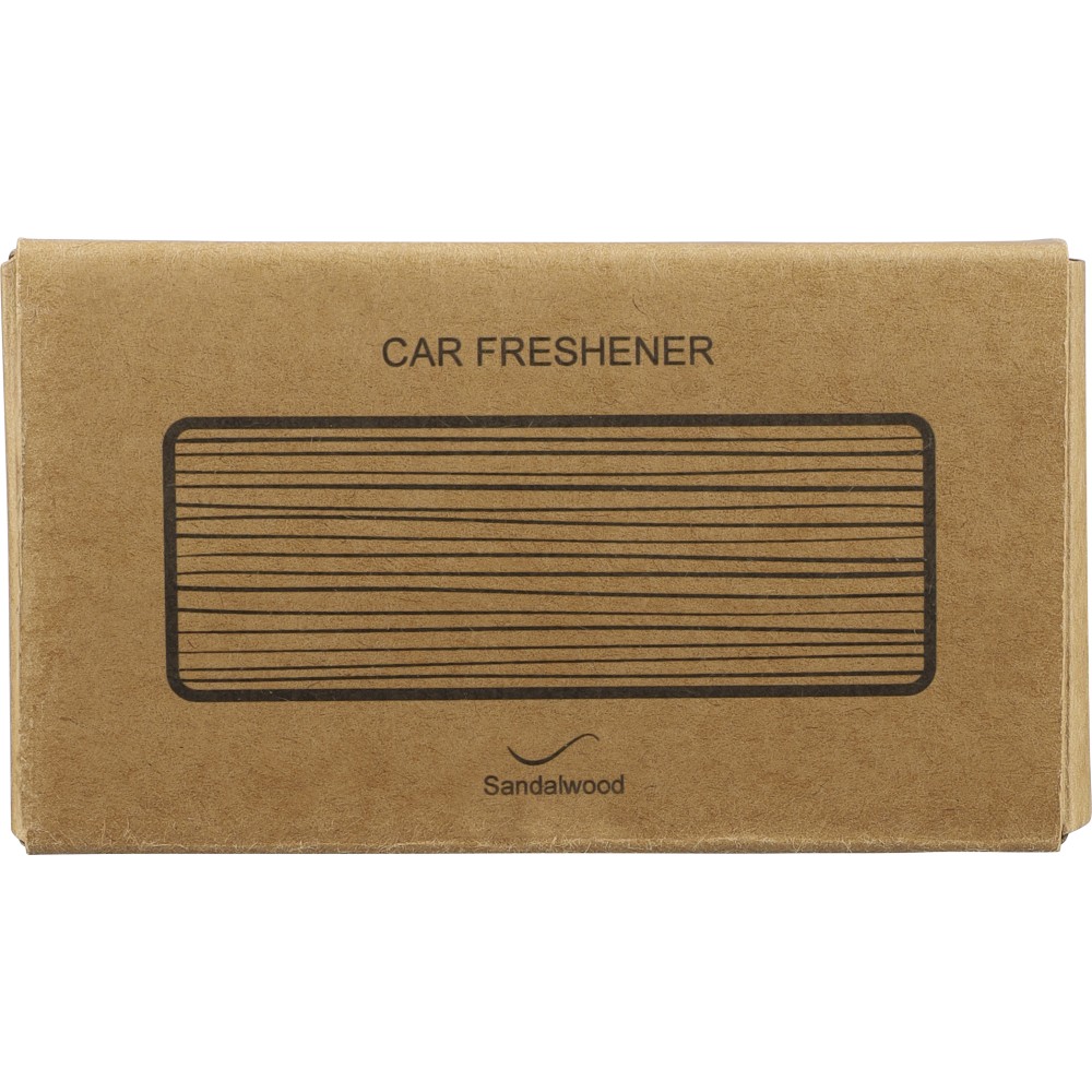 Natural beechwood car refresher with 2 × 3 g alcohol-free sandalwood scent (one pre-filled, one refill). Includes ABS clip for car vent. Packed in brown cardboard box with illustration.