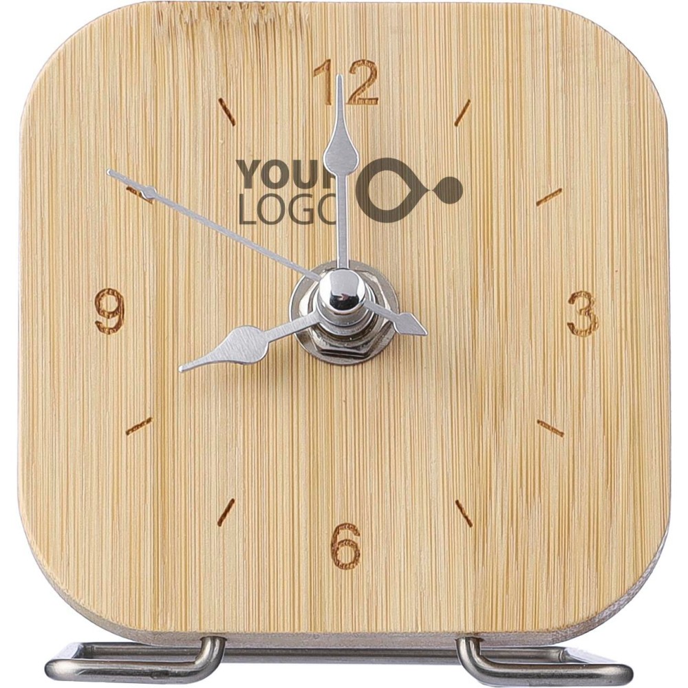 Bamboo clock with silver pointers and stand. Battery included. Individually packaged in a brown cardboard box.