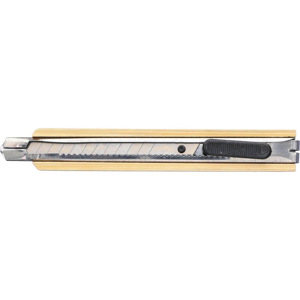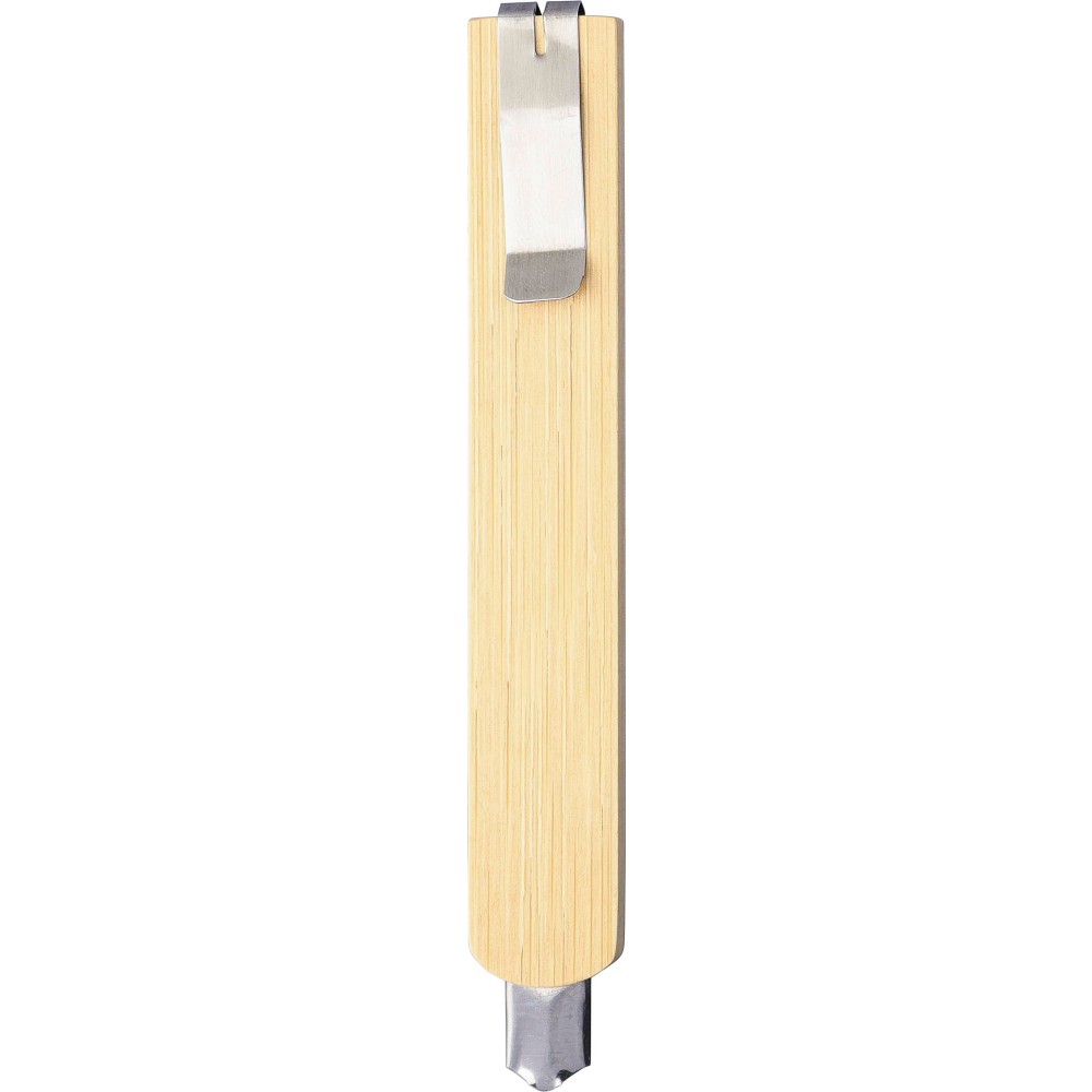Metal cutter with a bamboo body. Features a metal clip on the back to attach the knife when not in use. The blades are made from carbon steel. Individually packaged in a recycled polybag.