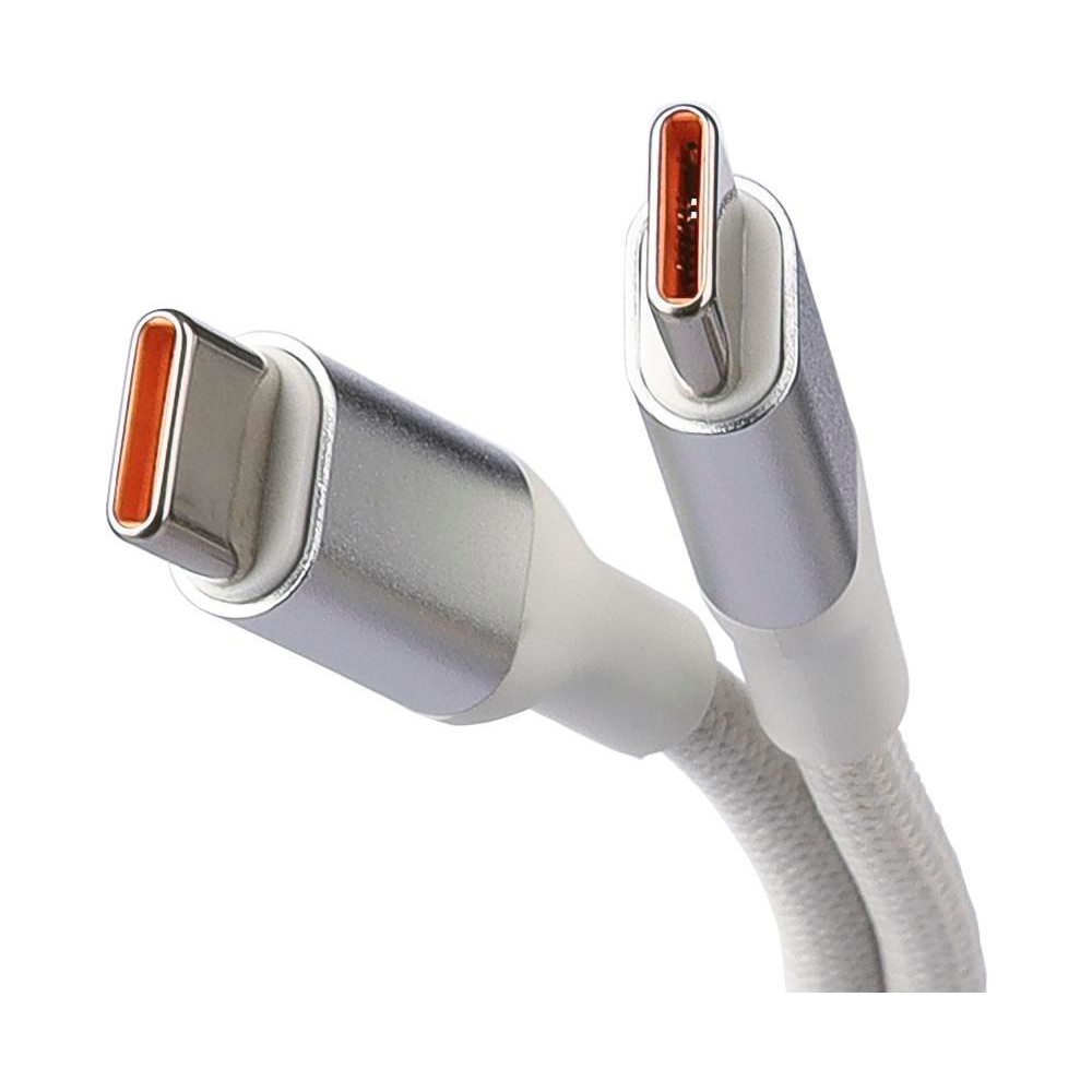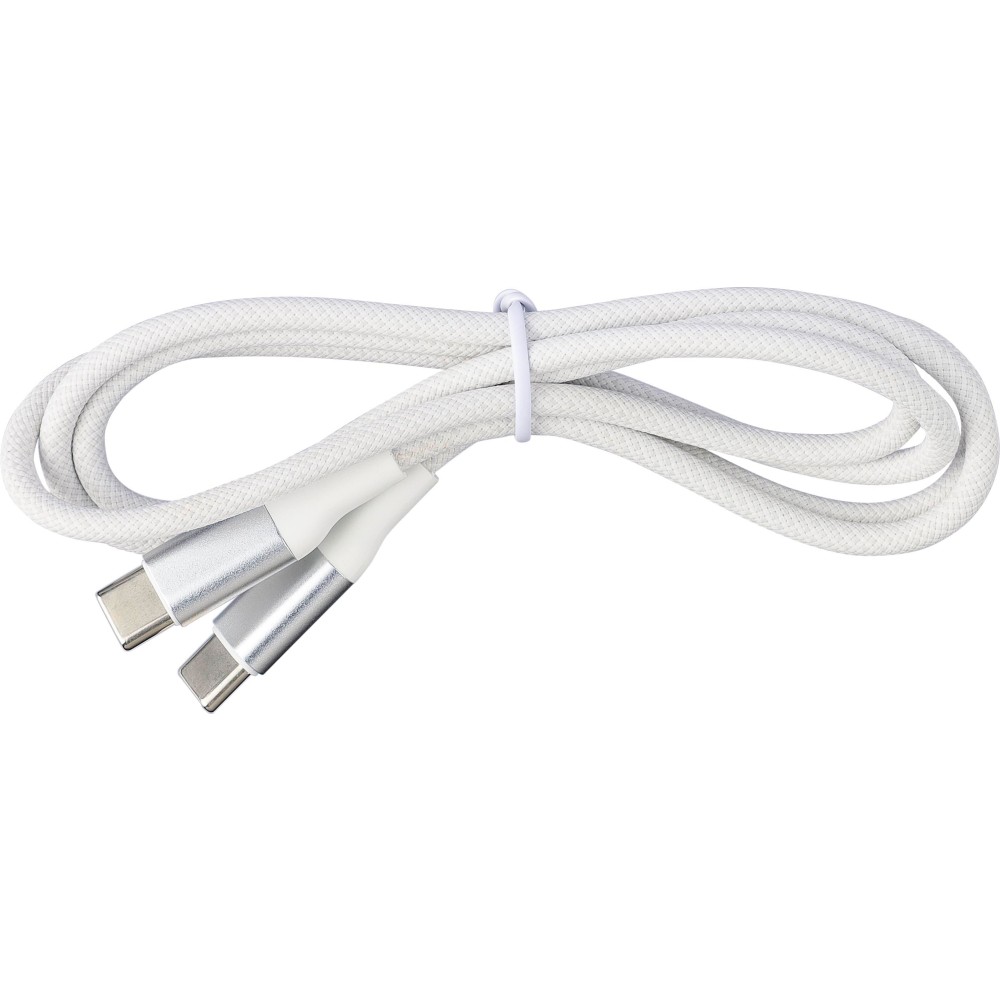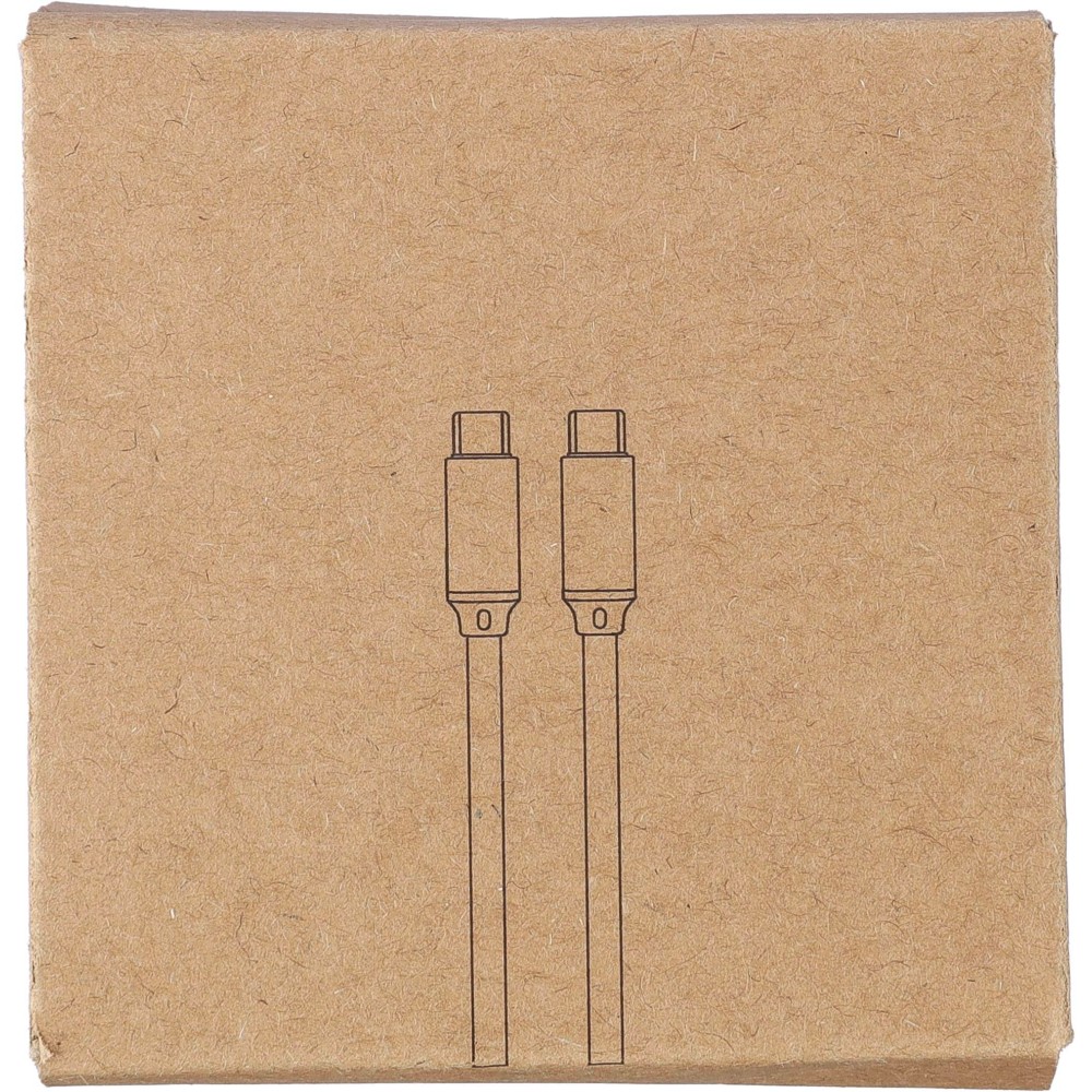 Nylon Type-C to Type-C data and charging cable with a length of 1 meter. Data transfer speed of 120 Mbps. The aluminum socket is enlarged to allow printing. 35W charging output. Individually packaged in a brown cardboard gift box.