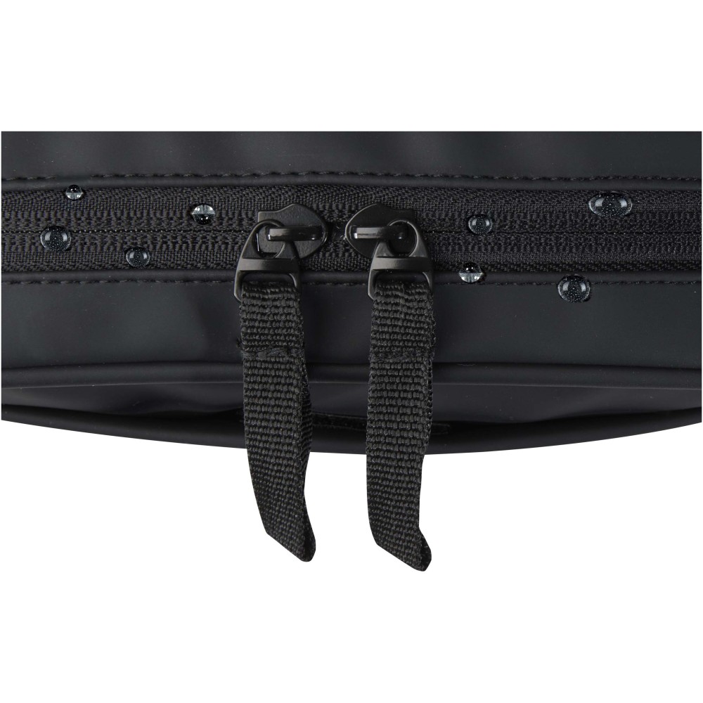 Made from GRS certified recycled PU leather with a matching RPET lining, this tech pouch is designed for travellers, remote workers, and tech enthusiasts. Compact and easy to carry in a backpack or cabin bag, it has a zipped main compartment with practical organisation features including an elastic pen loop, two mesh pockets for earbuds and small accessories, a reinforced divider, and multiple elastic loops to securely hold cables, USB drives, and chargers. The exterior includes a front pocket with hook-and-loop closure for quick access, along with a webbing handle for convenience. Finished with a water-resistant coating, it keeps your essentials protected wherever you go. Volume capacity: 1 litre.