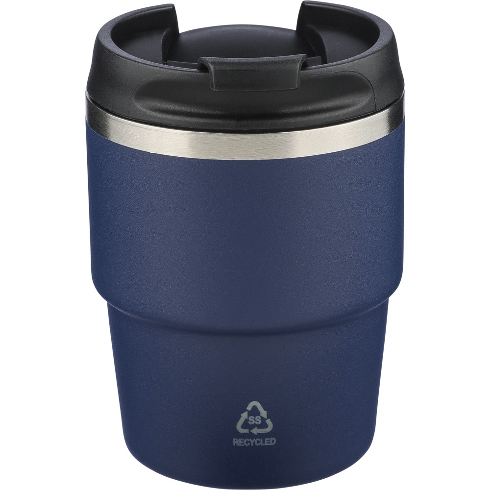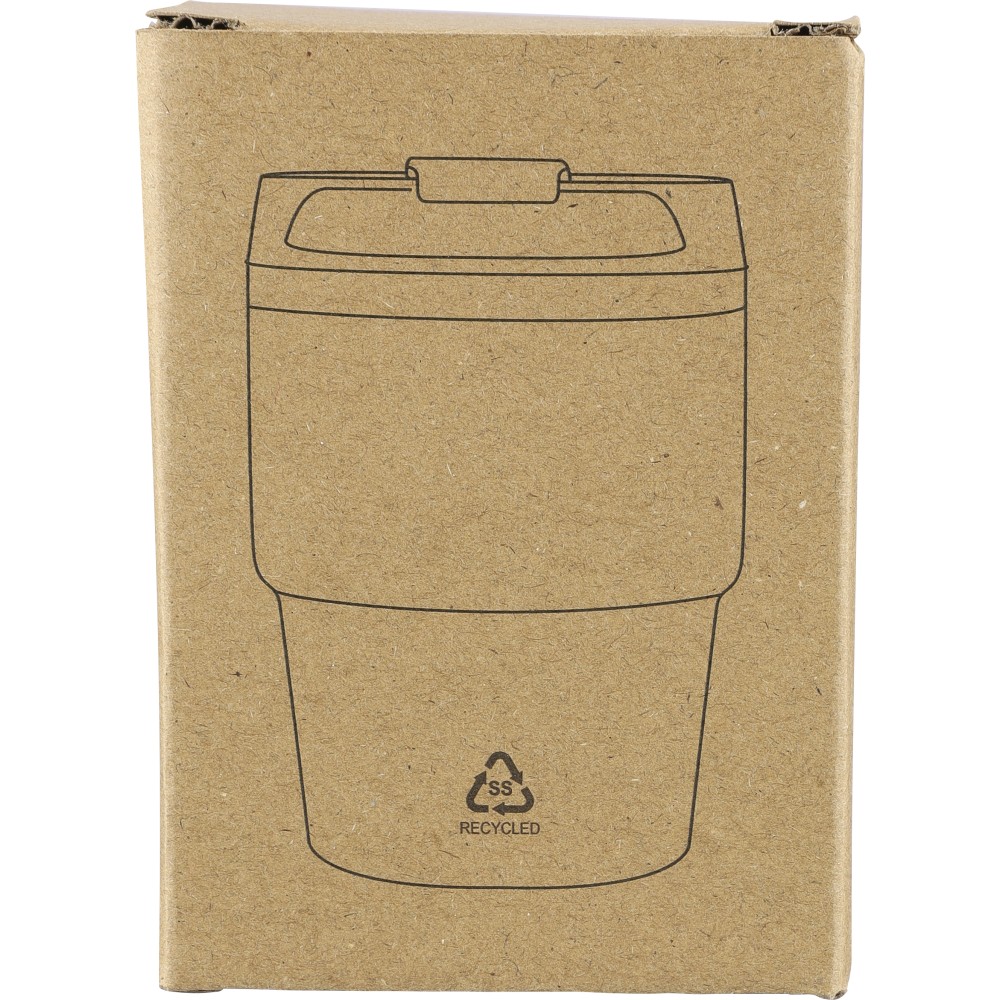 Recycled stainless steel vacuum mug (175 ml) with double-wall construction, powder coating, PP screw lid, and laser-engraved recycled logo. Compact design fits most coffee machines. Packed in a brown cardboard box.