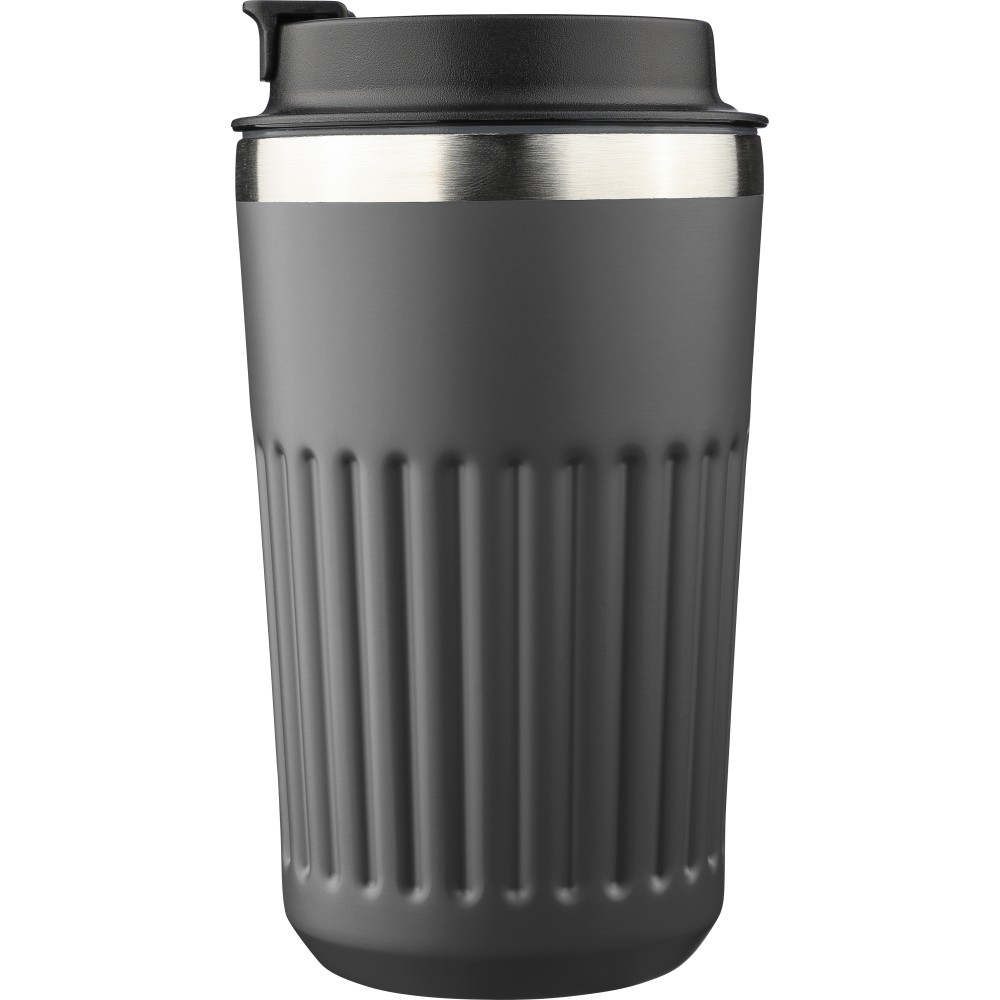 Recycled stainless steel travel mug (400 ml) with double wall and outer ridges. Inner 304 stainless steel, outer 201 stainless steel, with PP lid. Engraved recycled logo on the body. Packed in brown cardboard box.