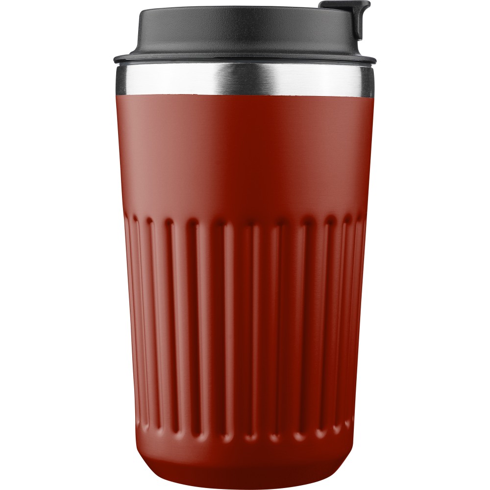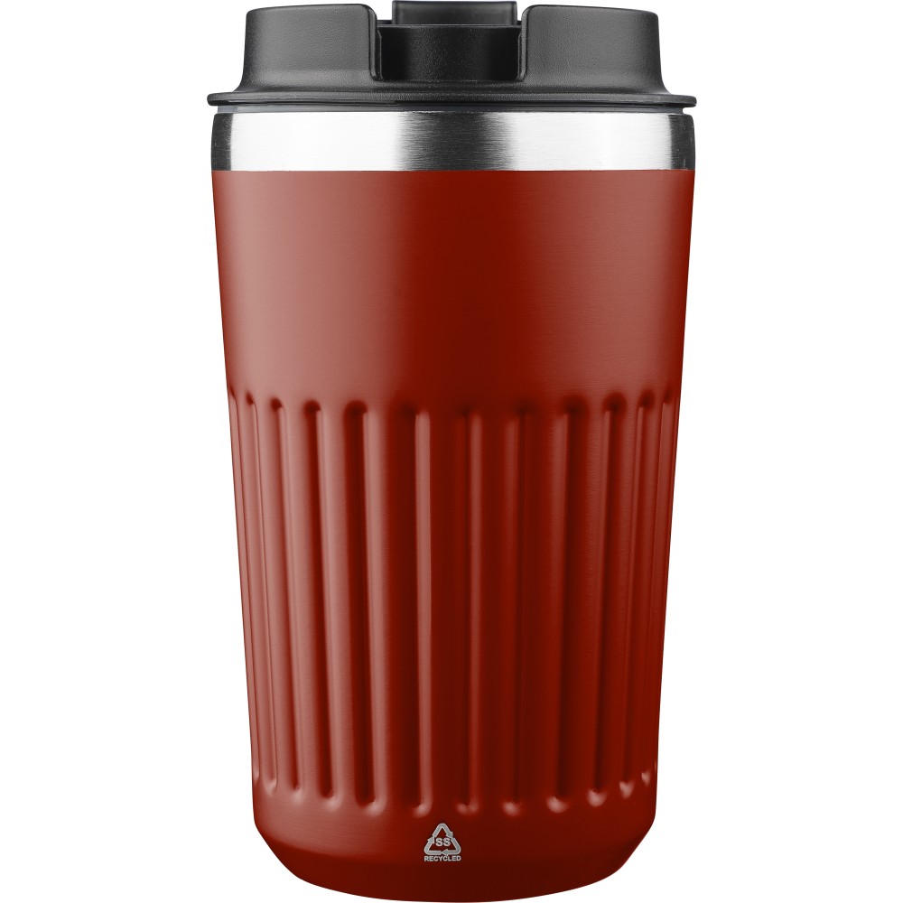 Recycled stainless steel travel mug (400 ml) with double wall and outer ridges. Inner 304 stainless steel, outer 201 stainless steel, with PP lid. Engraved recycled logo on the body. Packed in brown cardboard box.