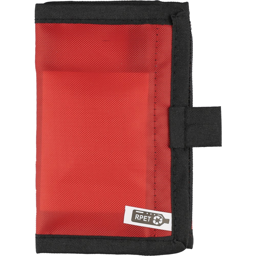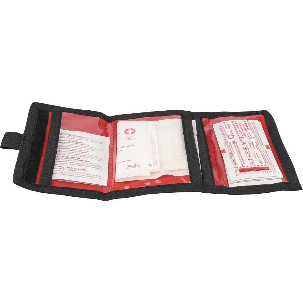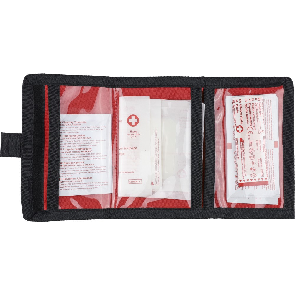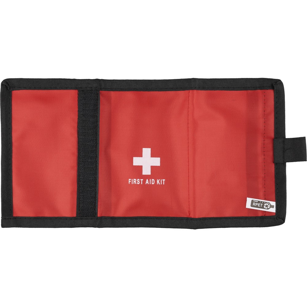 rPET 600D polyester first aid pouch with velcro closure and carrying loop. Includes PVC pockets and 17 parts: 5 plasters, 1 sterile film dressing, 1 non-woven sponge, 8 alcohol pads, 2 cleaning towelettes. Finished with rPET label outside.