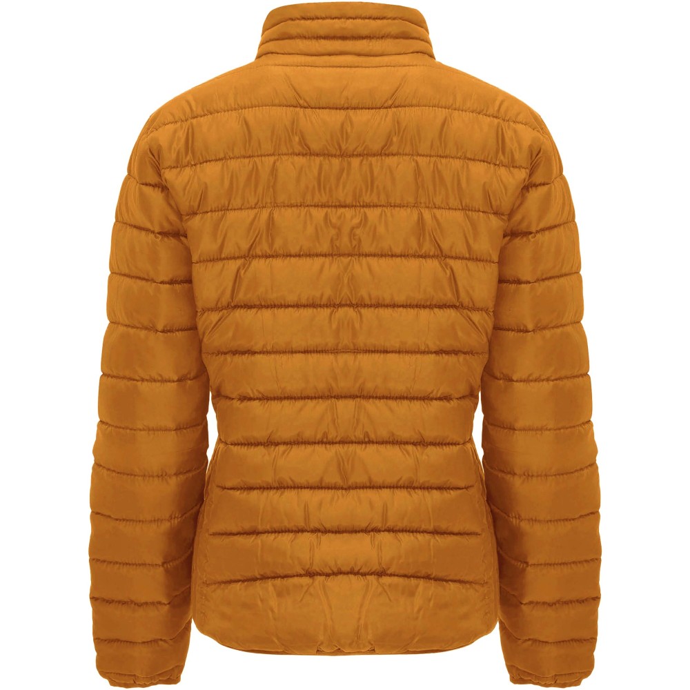 Women's quilted jacket with feather touch padding. Inverted zippers with matching chin protector and puller. Two front pockets with zippers. Matching elastic edging in collar, cuffs and hem. Contrasting inner lining. Includes stow carry bag. Lightweight and foldable garment. Fitted cut. Removable label. Water resistant. Wind-proof. The model is 179 cm and is wearing size S.