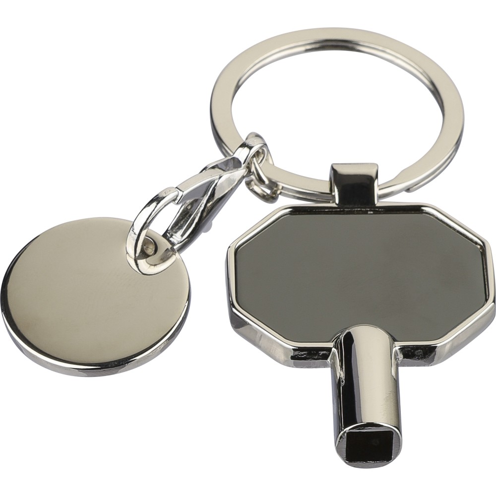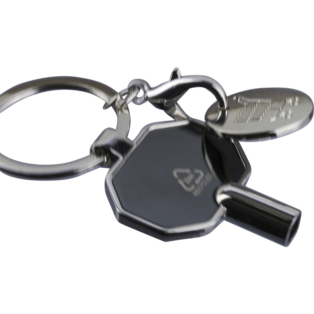 Recycled zinc alloy radiator bleed keychain with shopping coin. Includes 5×5 mm square key, standard in Europe for radiator bleeding. Comes with sturdy metal keyring and recycled logo. Packed in a brown carton envelope with illustration.