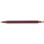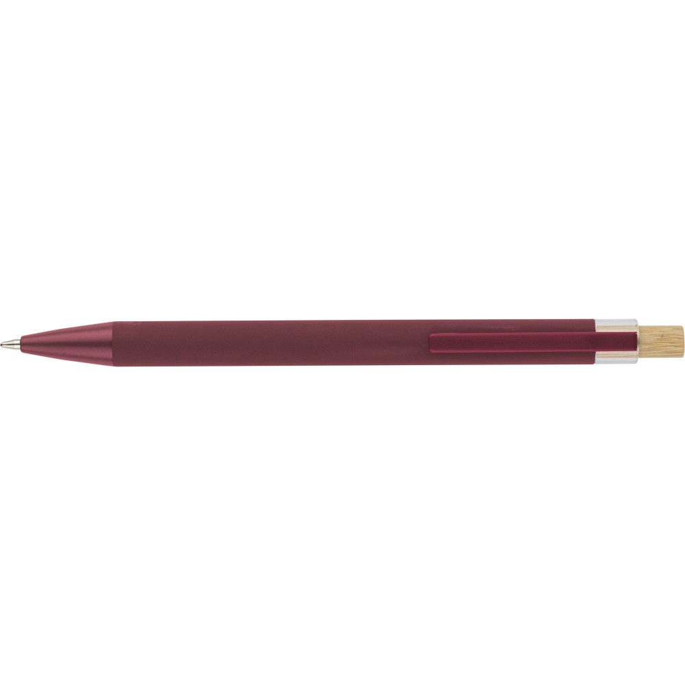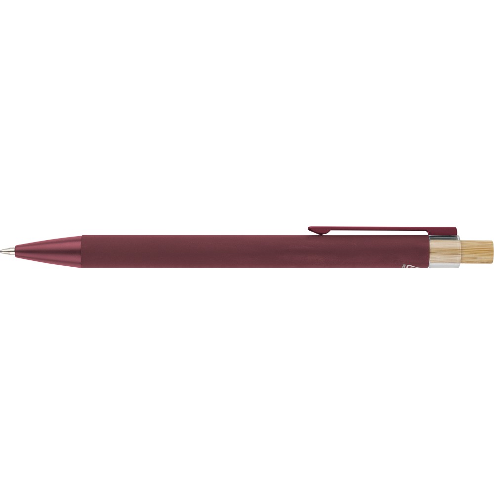 Recycled aluminium ballpen with bamboo push button featuring an AS plastic detail. Includes a metal clip and plastic tip, both in matching colors. Laser-engraved recycled logo on the barrel. Approximate writing length of 800 metres. Blue ink.