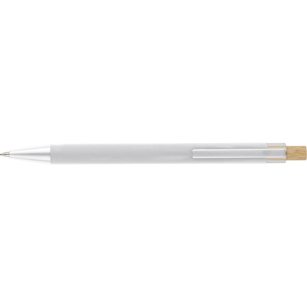 Recycled aluminium ballpen with bamboo push button featuring an AS plastic detail. Includes a metal clip and plastic tip, both in matching colors. Laser-engraved recycled logo on the barrel. Approximate writing length of 800 metres. Blue ink.