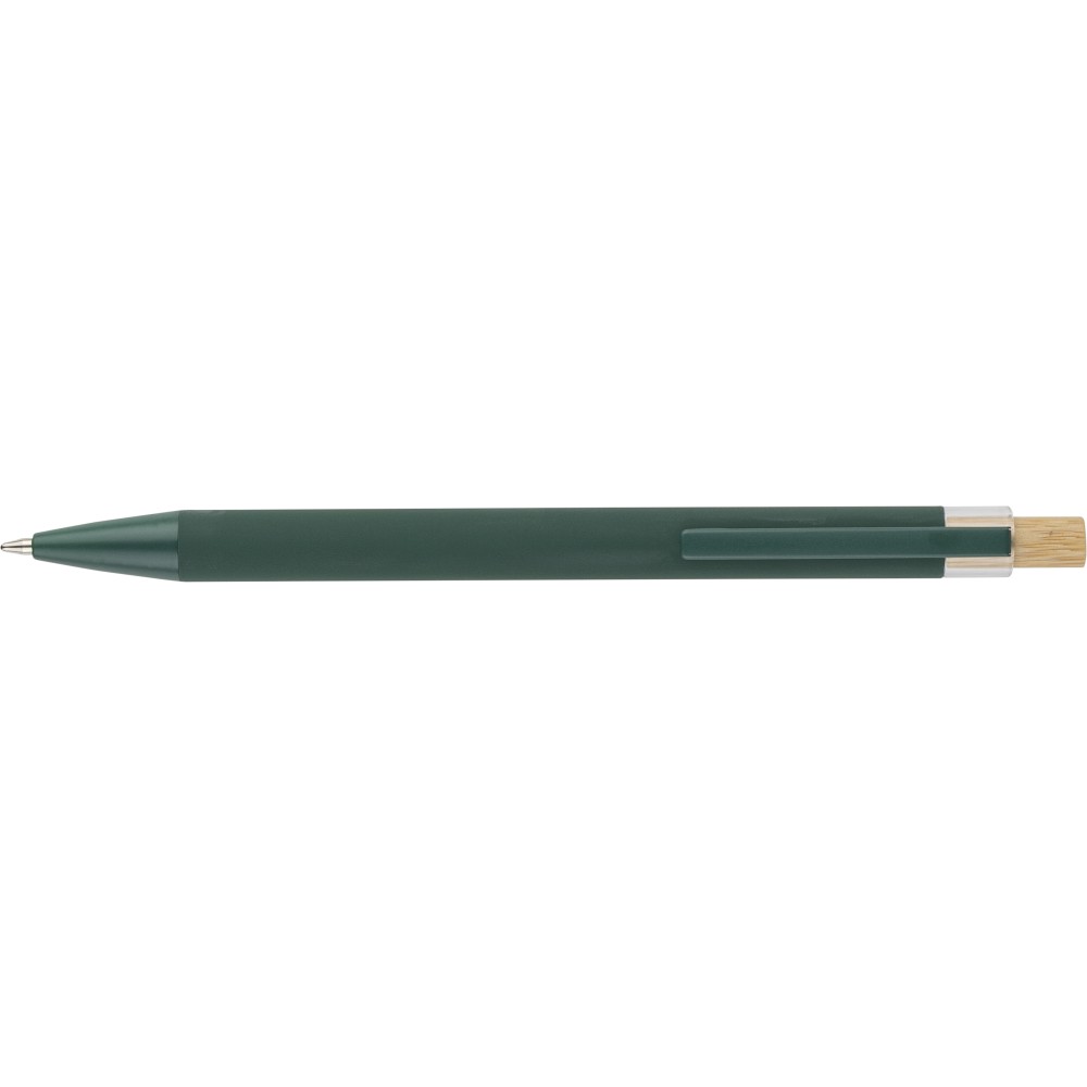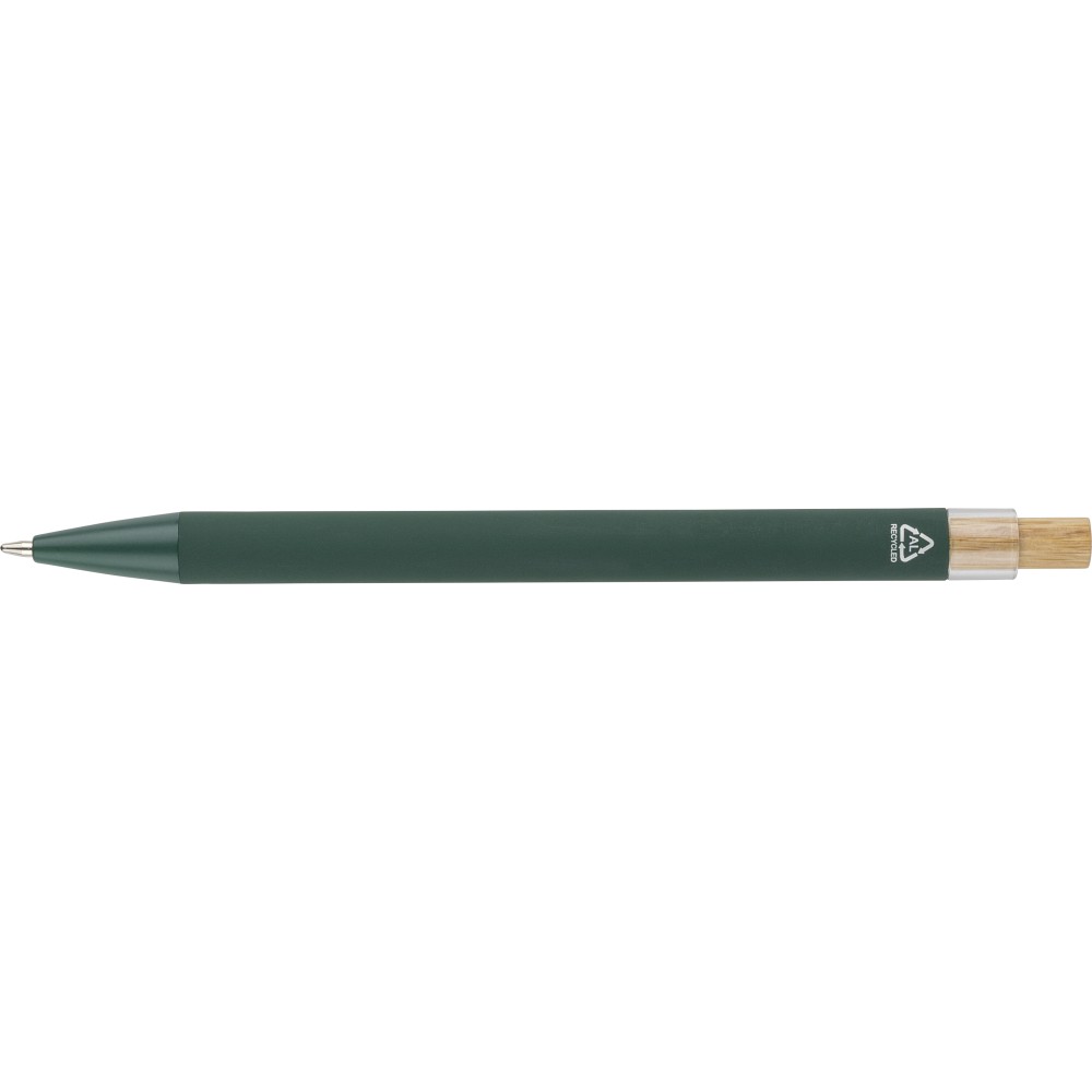 Recycled aluminium ballpen with bamboo push button featuring an AS plastic detail. Includes a metal clip and plastic tip, both in matching colors. Laser-engraved recycled logo on the barrel. Approximate writing length of 800 metres. Blue ink.