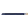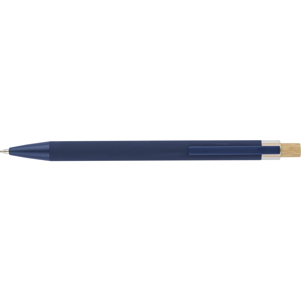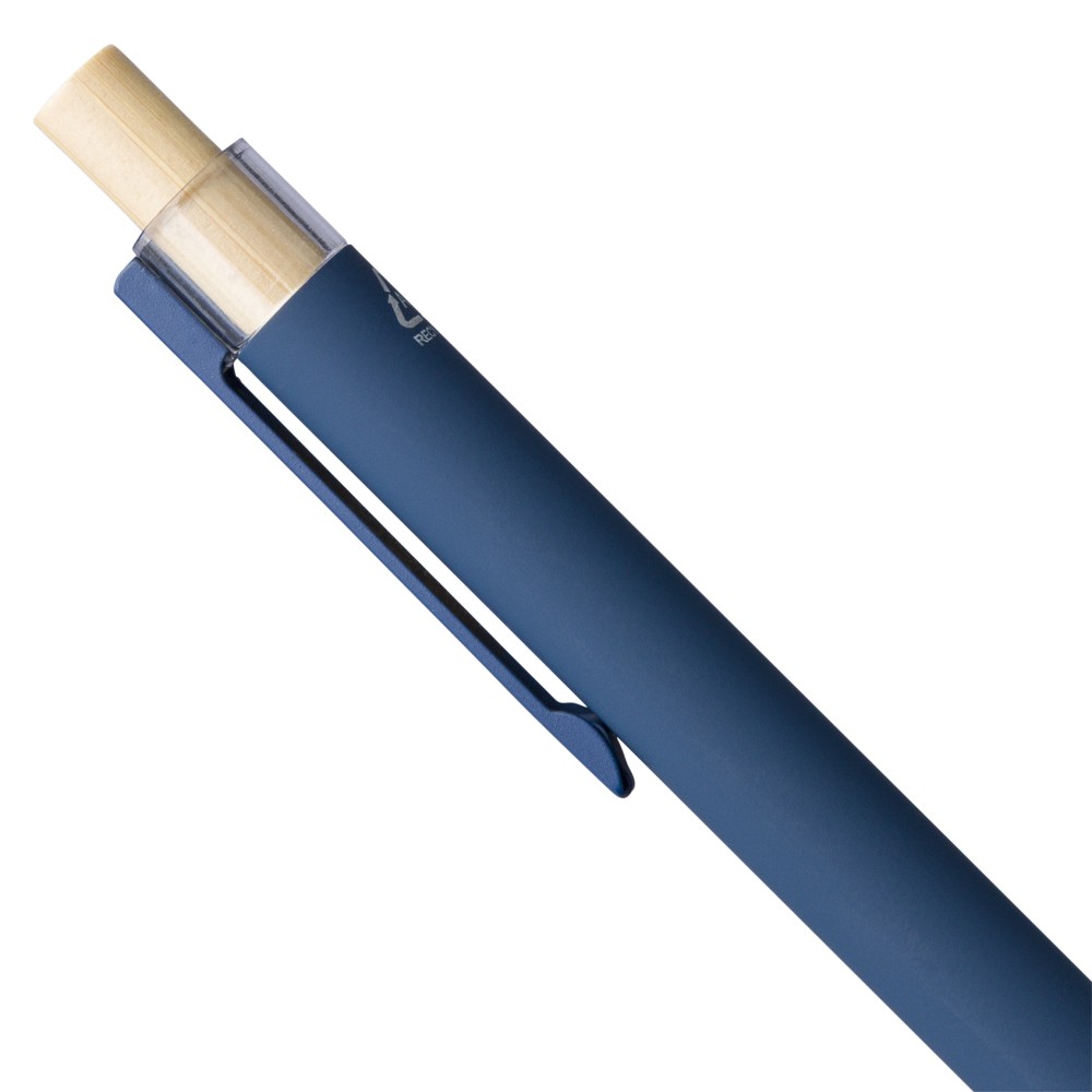 Recycled aluminium ballpen with bamboo push button featuring an AS plastic detail. Includes a metal clip and plastic tip, both in matching colors. Laser-engraved recycled logo on the barrel. Approximate writing length of 800 metres. Blue ink.