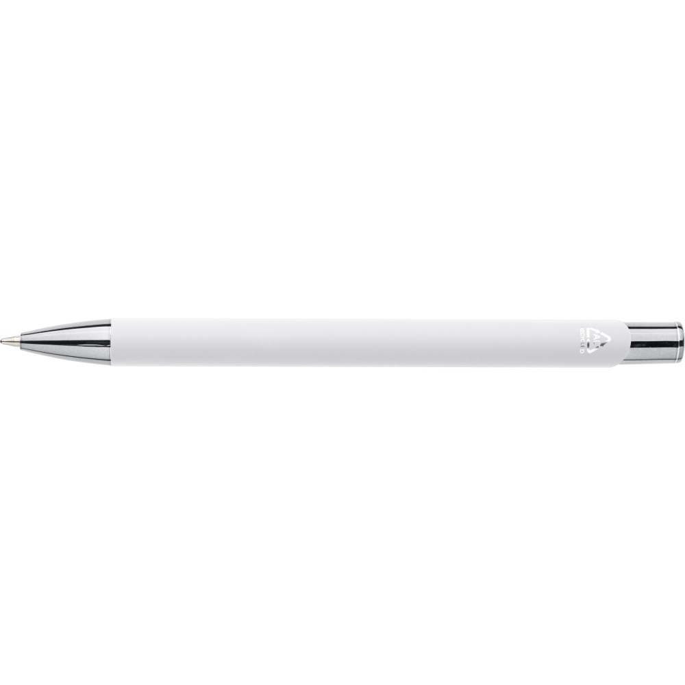 Recycled aluminium rubberized ballpen with matching UV-coated plastic and metal details. Shiny mirror effect appears after engraving. Features engraved recycled logo and writes approx. 800 metres. Blue ink.