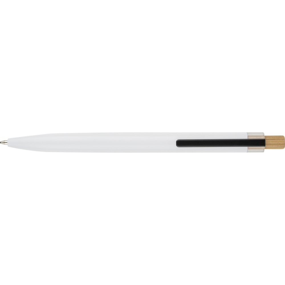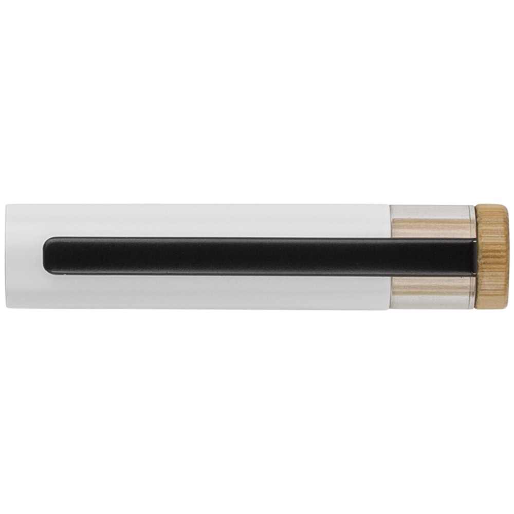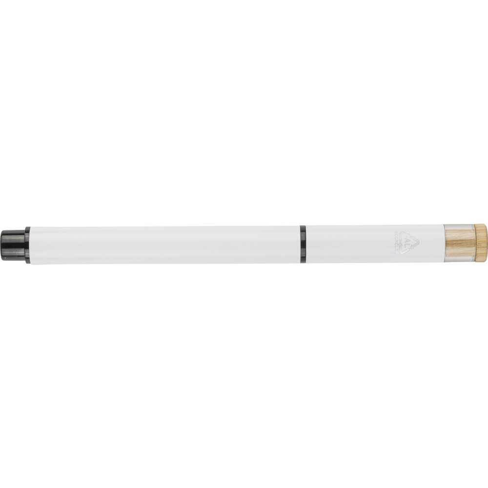 Recycled aluminium lacquered pen set with ballpen and roller pen. Features bamboo pusher, rPET trim, and metal clip; roller pen includes bamboo/rPET cap detail and matching clip. Both with engraved recycled logo. Writes approx. 700 m (ballpen) and 500 m (roller pen). Blue ink. Packed in colored recycled cardboard gift box.