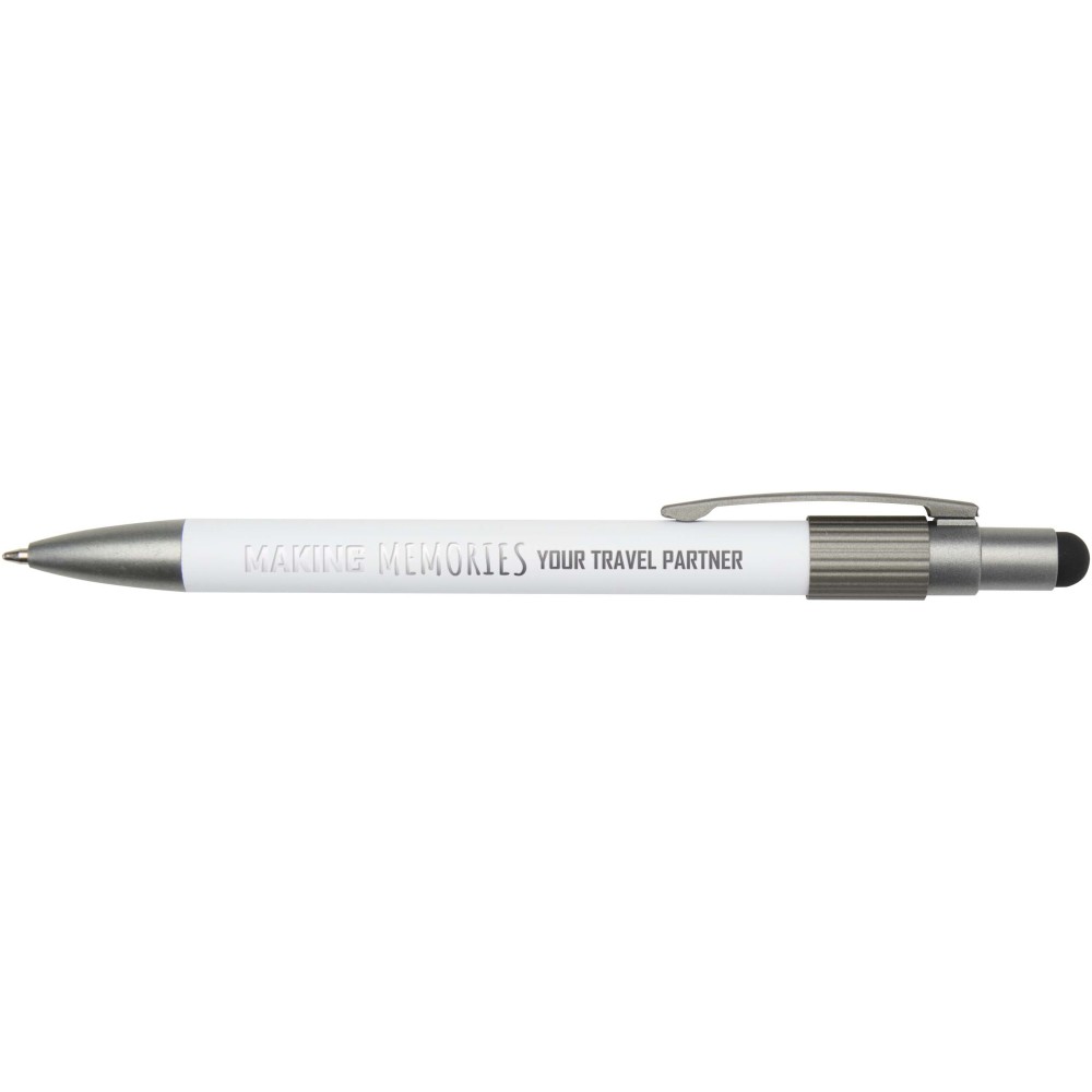 Ballpoint pen with stylus and fidget spinner, combining practicality with a playful design. The pen is made from RCS certified recycled aluminium and features a smooth push mechanism and a stylus tip for touchscreen use. A built-in fidget spinner on top adds a stress-relieving touch (just flick to activate). Pen ink colour: black. Writing length: 1000 metres.