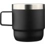 Recycled stainless steel cup (180 ml) with double-wall construction, ceramic inner coating, handle, and laser-engraved recycled stainless steel logo. Packed in a brown cardboard box.