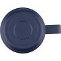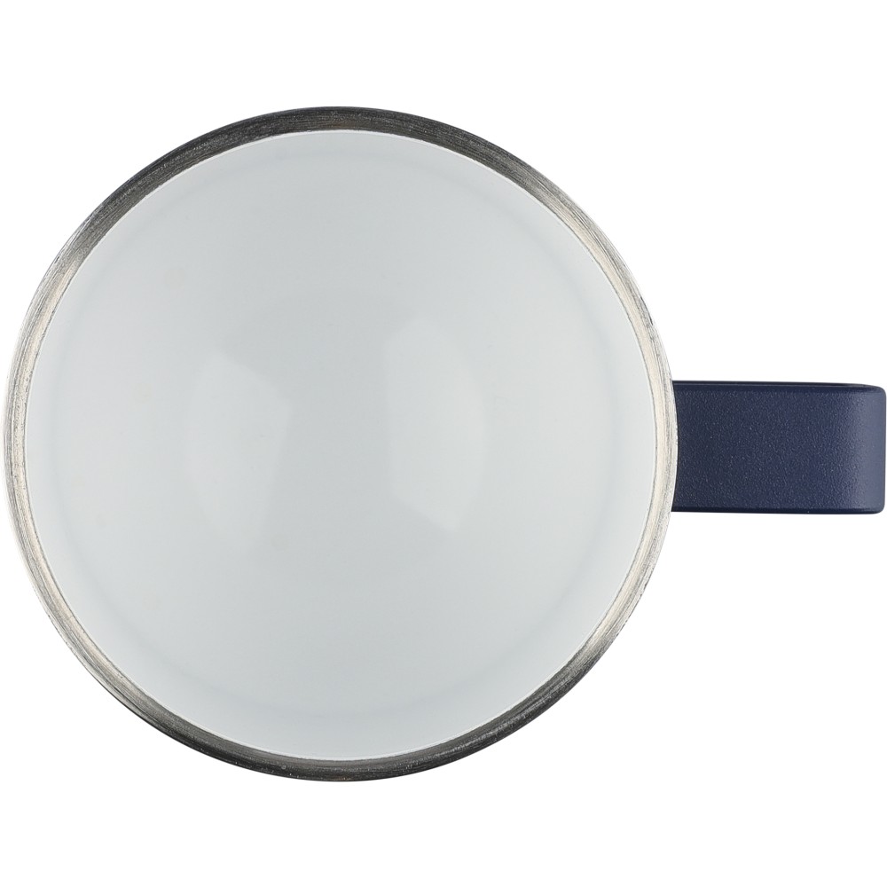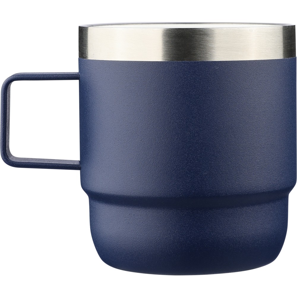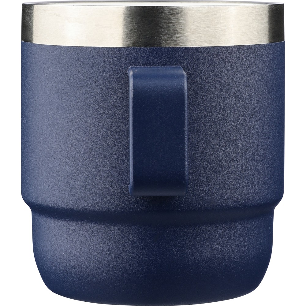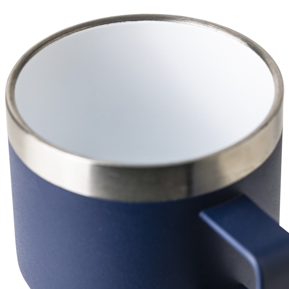 Recycled stainless steel cup (180 ml) with double-wall construction, ceramic inner coating, handle, and laser-engraved recycled stainless steel logo. Packed in a brown cardboard box.