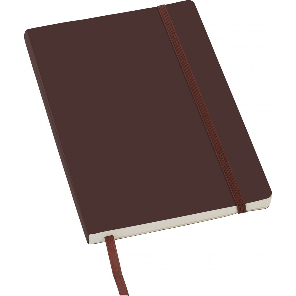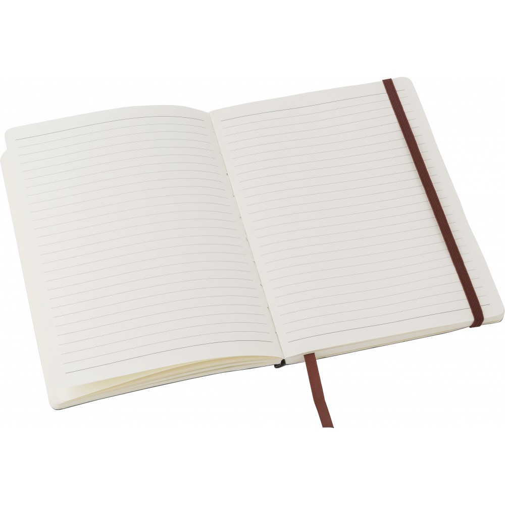 PU soft cover notebook (approx. A5) with 80 lined pages, ribbon marker, elastic band over the cover, and a pocket on the inside of the cover.