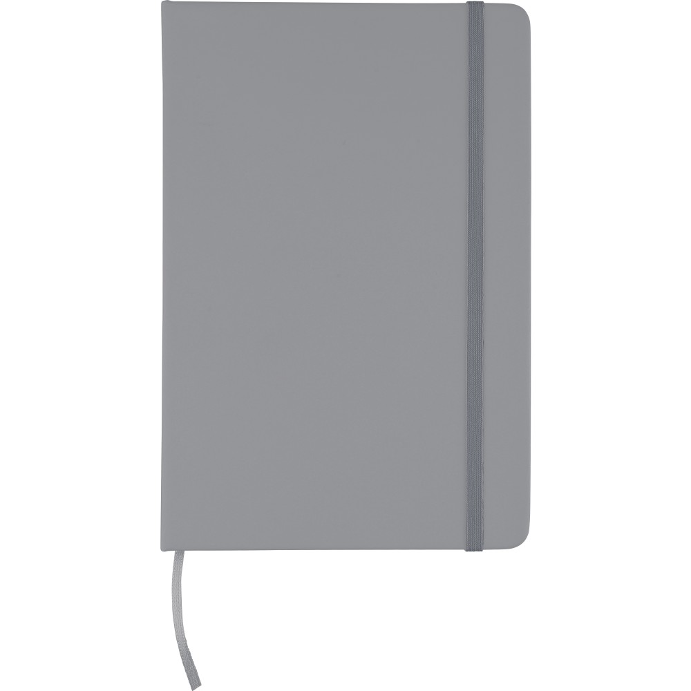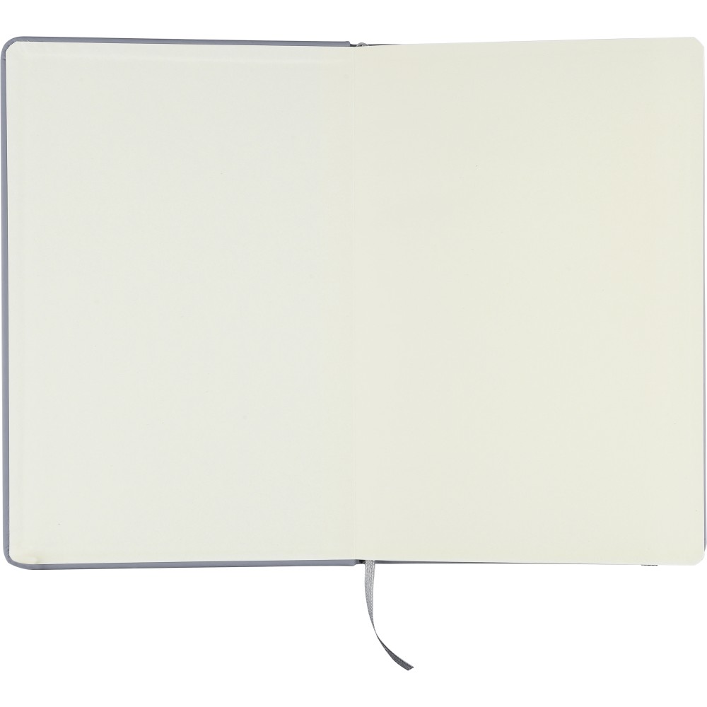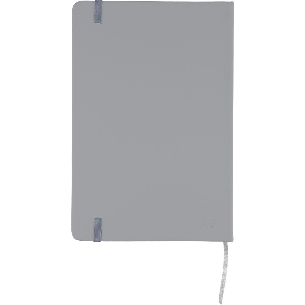 rPET notebook (approx. A5) with a hard cover made of rPET PU, containing 80 lined pages (70 gsm). Features an elastic band and ribbon in a matching color. Includes an embossed recycled logo on the backside.