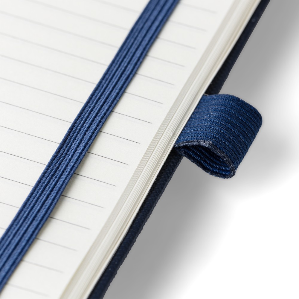 rPET 600D polyester notebook with PU coating, paper size A5. Contains 80 sheets of 70 gsm lined paper and features a ribbon bookmark, elastic band, and pen loop. Semi-hard cover design. Includes an embossed recycled logo on the backside.