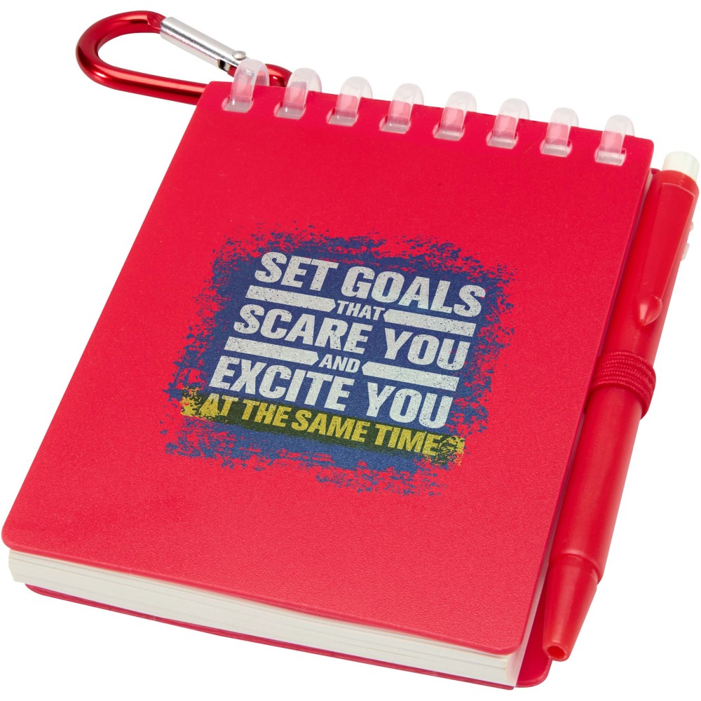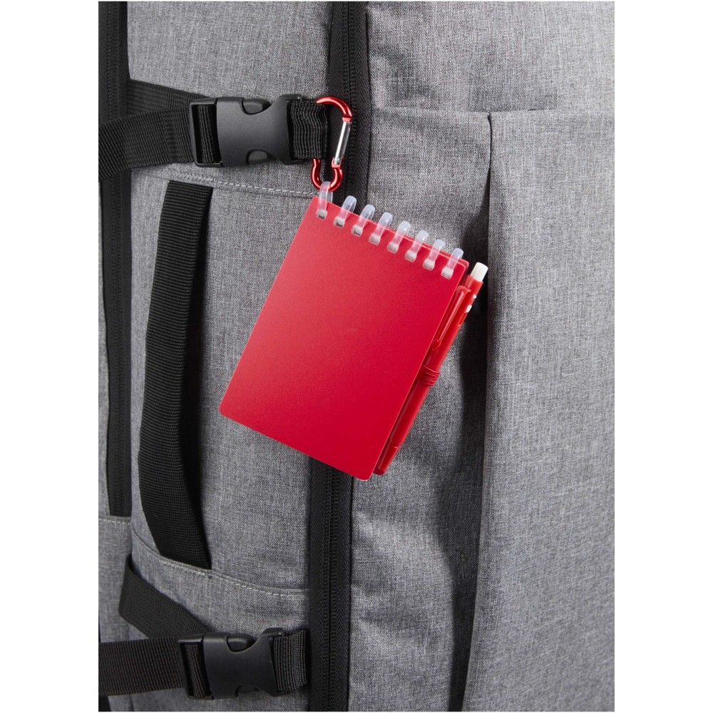 The Lig Mini notebook and pen set is a compact and practical companion for on-the-go note-taking. The spiral-bound notebook has a soft recycled plastic cover and 70 blank sheets of 120 g/m2 water-resistant stone paper, making it ideal for outdoor use. With rounded corners and a built-in pen loop, it embraces the mini-size trend while remaining functional. The matching ballpoint pen is made from recycled ABS plastic, writes in black ink, and offers a writing length of 250 metres. A colour-coordinated metal ring allows the set to be easily attached to a backpack, purse, or keychain, making it perfect for durable and portable note-taking. Notebook size: 11 × 7.5 cm.