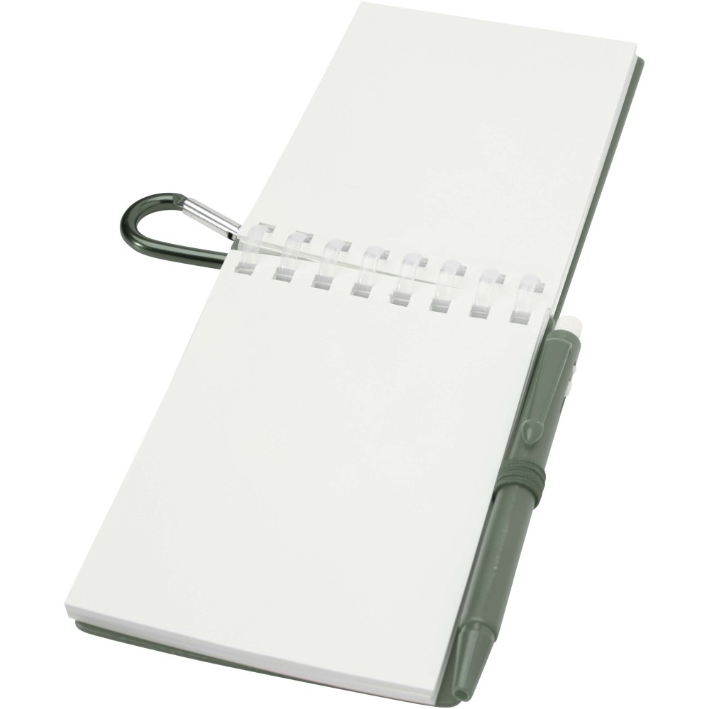 The Lig Mini notebook and pen set is a compact and practical companion for on-the-go note-taking. The spiral-bound notebook has a soft recycled plastic cover and 70 blank sheets of 120 g/m2 water-resistant stone paper, making it ideal for outdoor use. With rounded corners and a built-in pen loop, it embraces the mini-size trend while remaining functional. The matching ballpoint pen is made from recycled ABS plastic, writes in black ink, and offers a writing length of 250 metres. A colour-coordinated metal ring allows the set to be easily attached to a backpack, purse, or keychain, making it perfect for durable and portable note-taking. Notebook size: 11 × 7.5 cm.