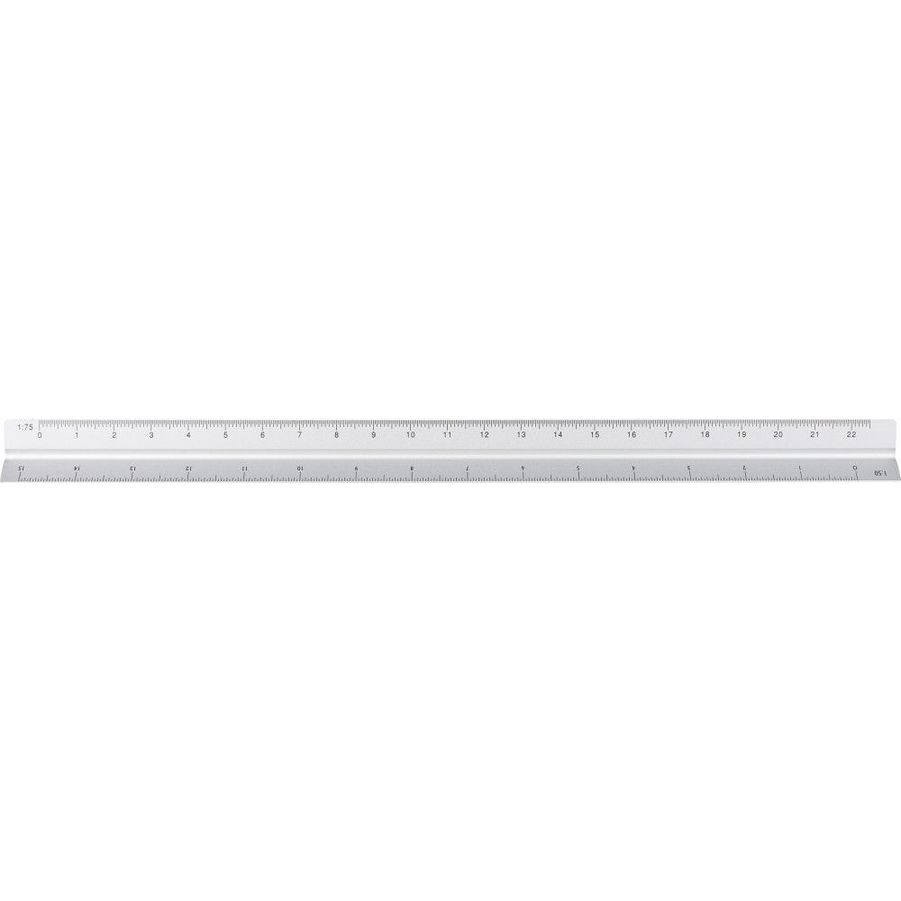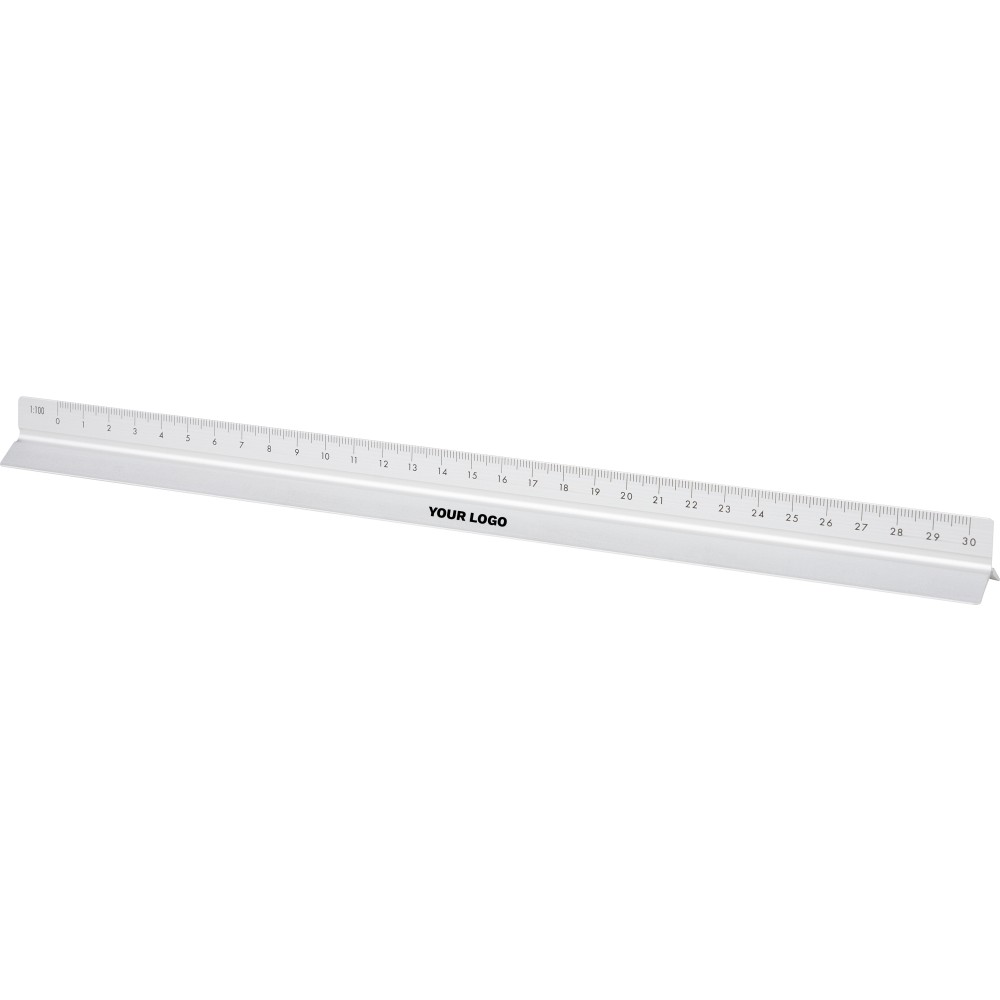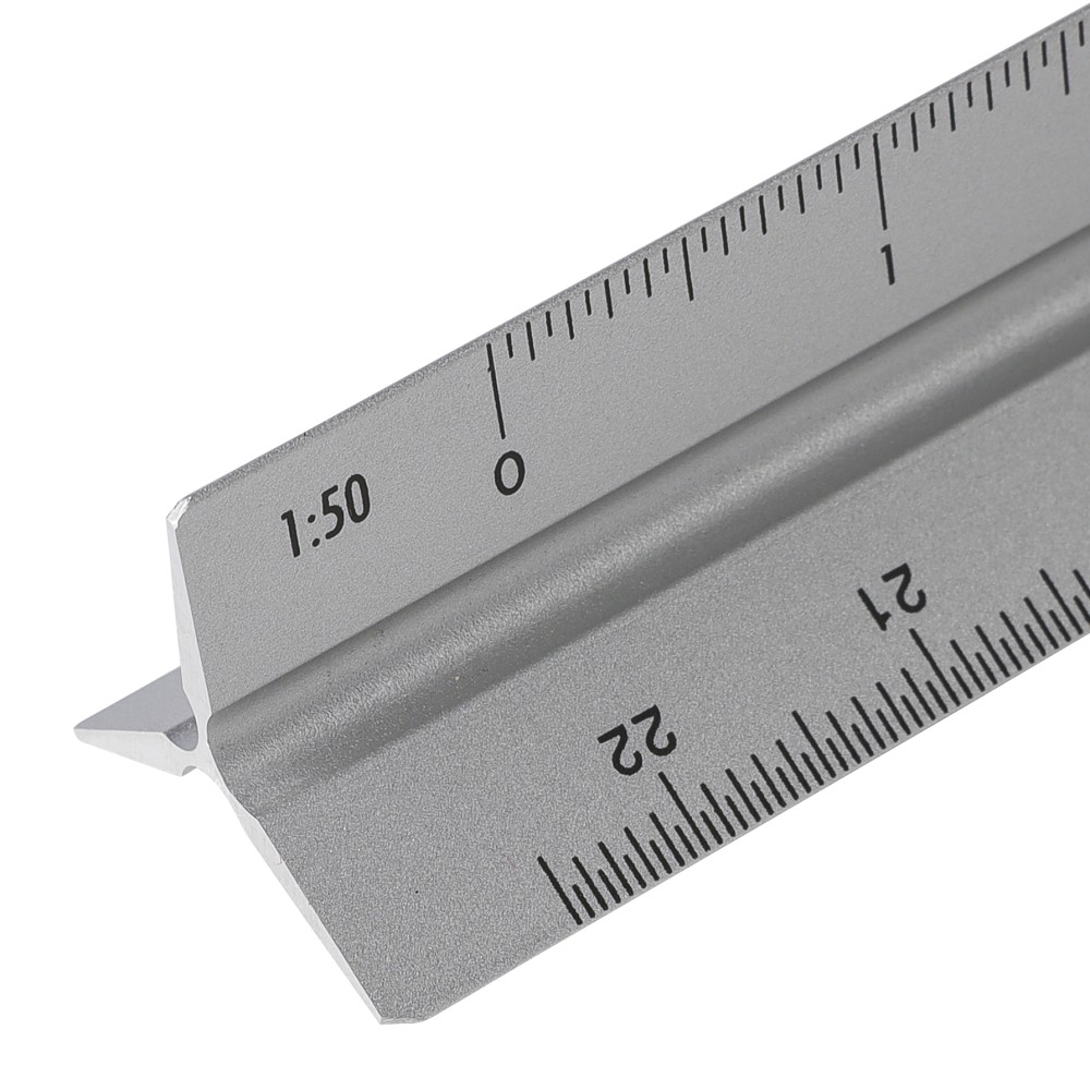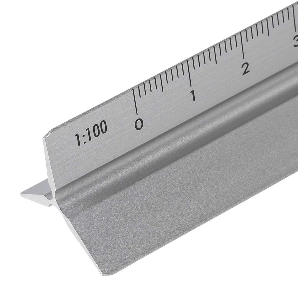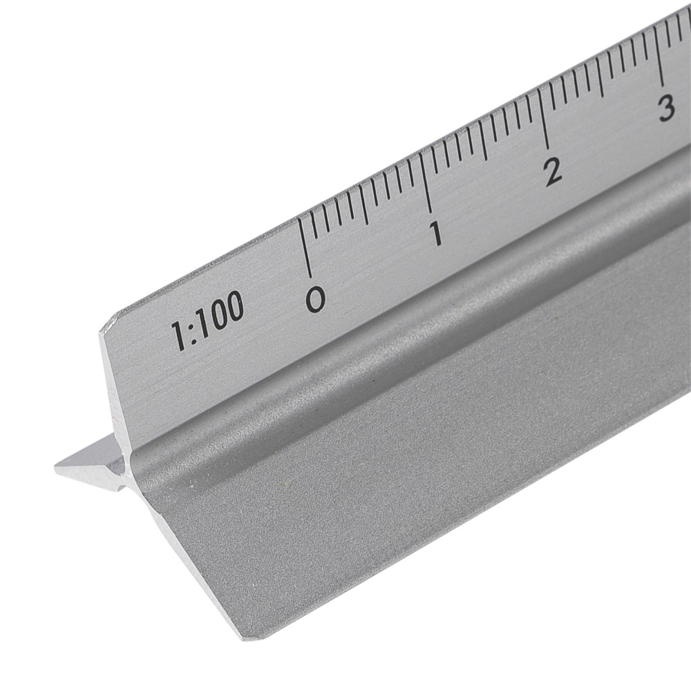 Aluminium 30 cm triangle-shaped ruler with multiple measuring scales: 1:20, 1:25, 1:50, 1:75, and 1:100. One side without scale for engraving. Includes both centimetre and inch markings. Individually packaged in a brown cardboard box.