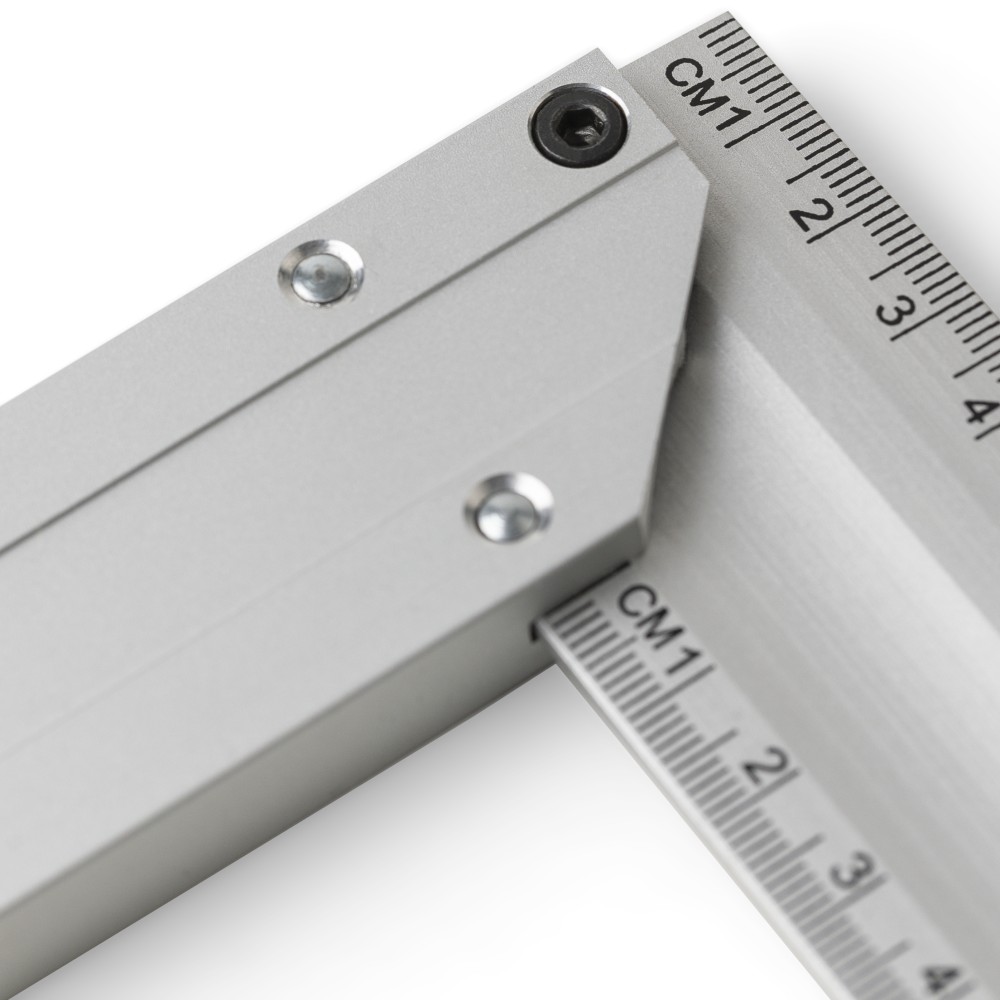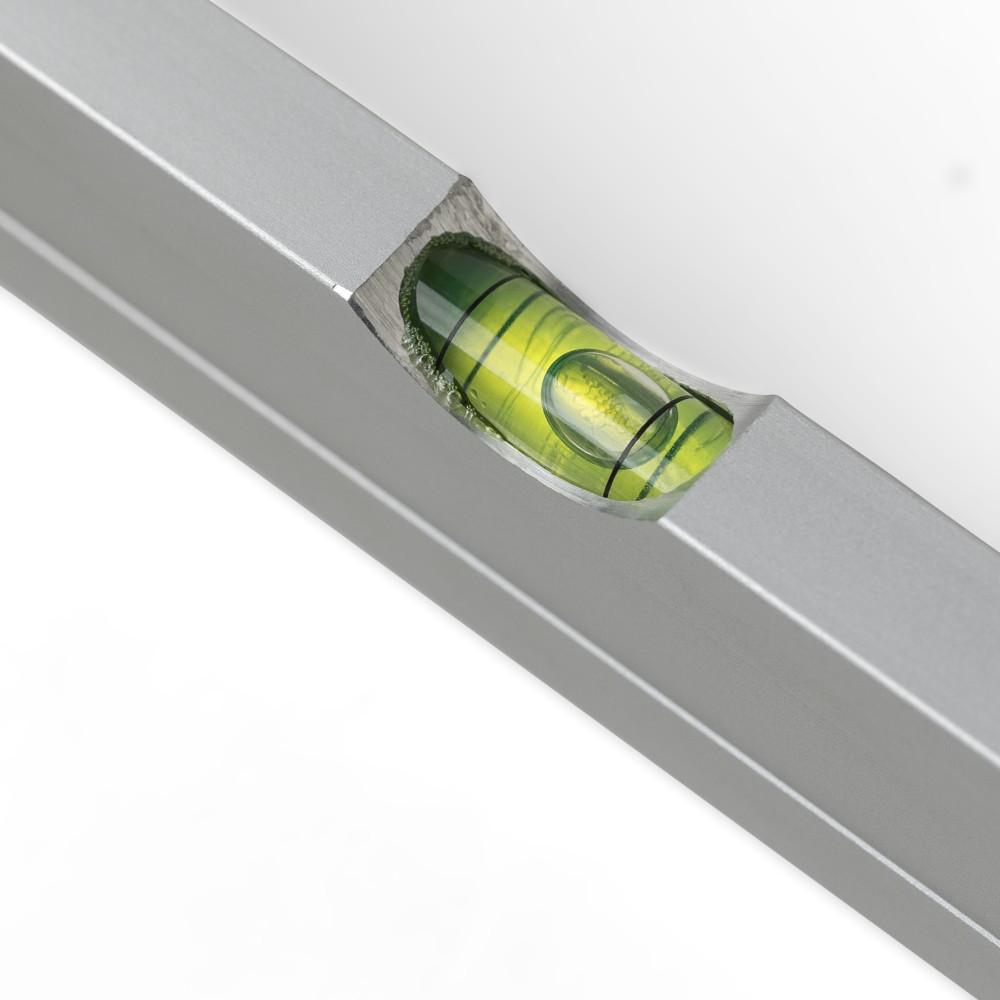 Aluminium set square with integrated spirit level. Length 30 cm with clear indication in centimeters. Practical design for precise measuring and leveling. Packed individually in a brown carton box with illustration.