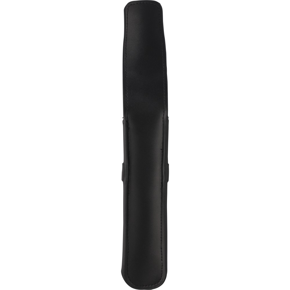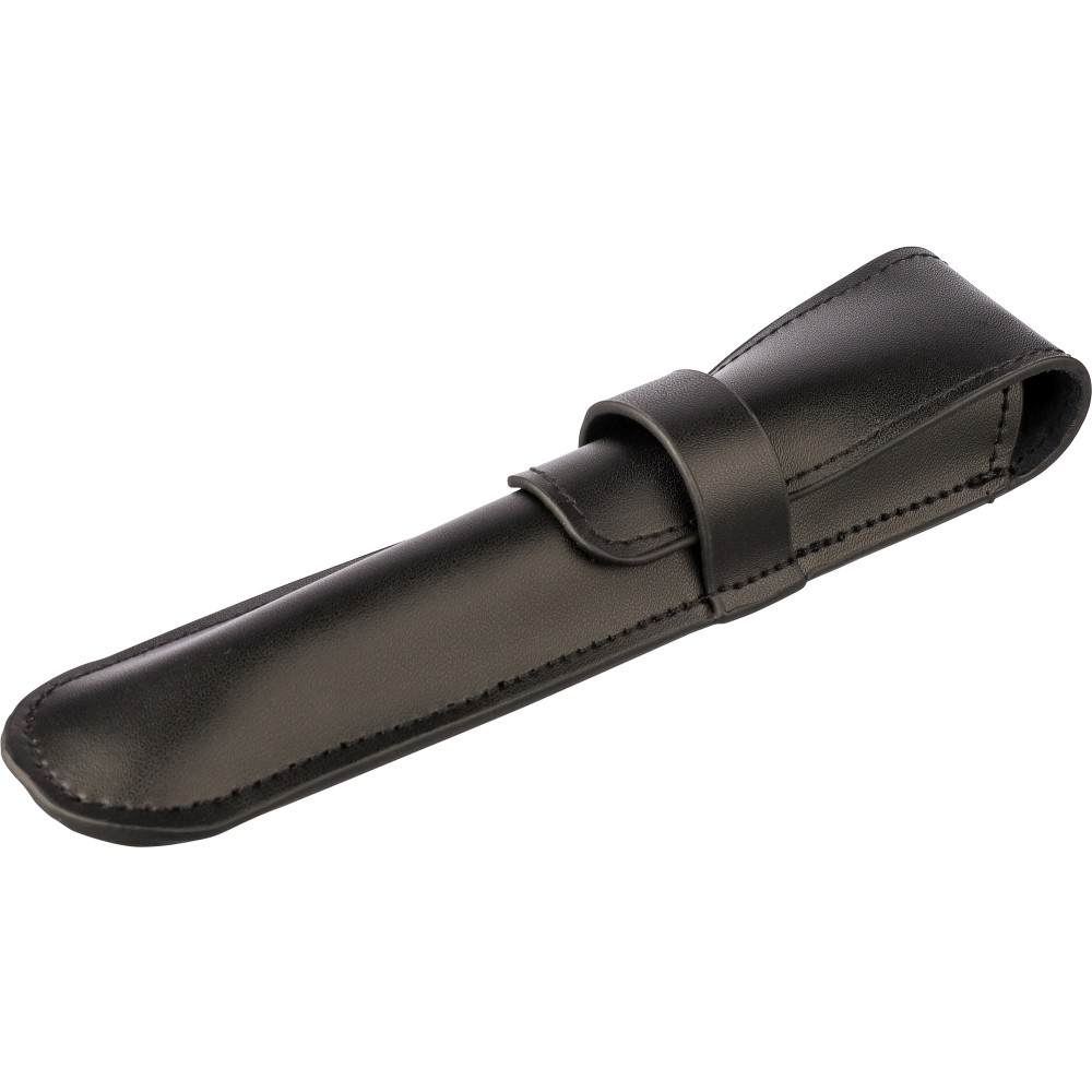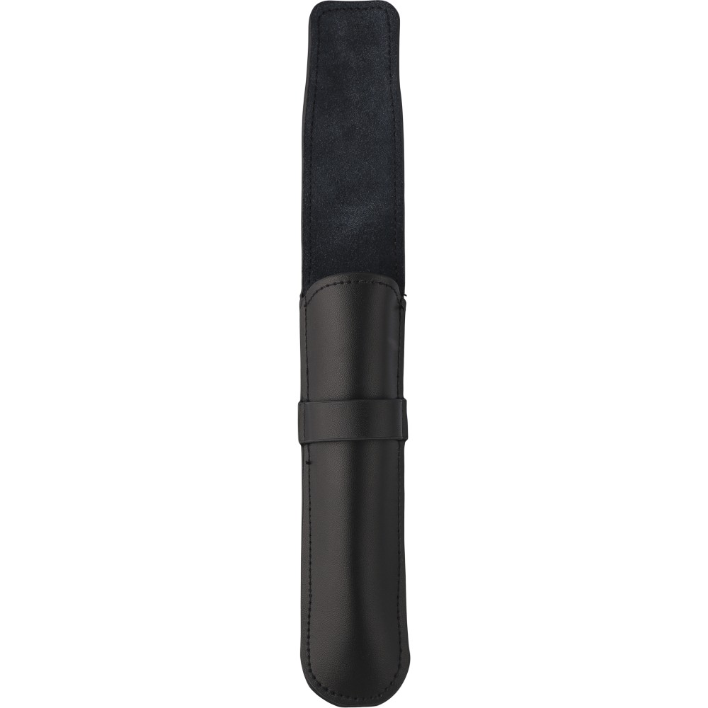 Leather (2-layered) pen pouch with flap and belt-style closing. Features a soft velvet interior. Individually packaged in a black carton sleeve. Cow leather.