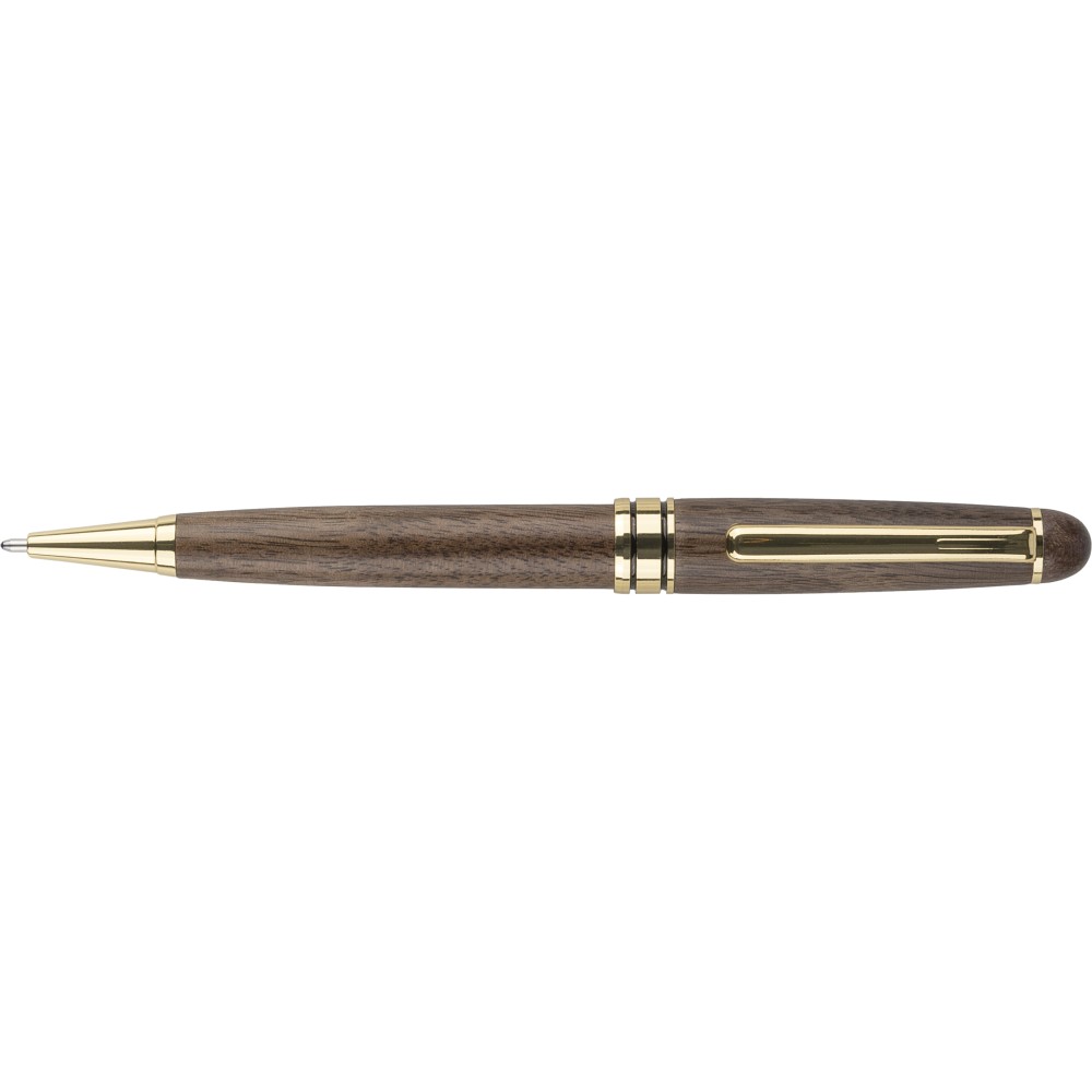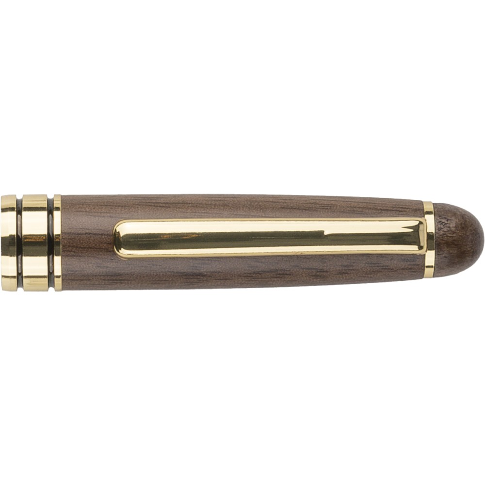 Walnut wood and brass pen set with twist ballpen (approx. 1,000 meters) and rollerball (up to 400 meters), both with blue German Dokumental ink. Ballpen features metal tip, clip, and trim. Packaged in maple wooden box and brown cardboard box.