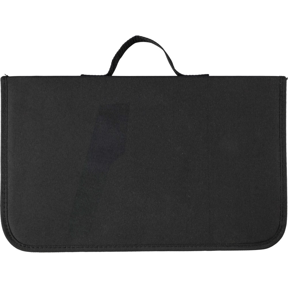 Stainless steel barbecue set with wooden handles. Tools include a knife, fork, tongs, and a wooden cutting board. Packaged in a 300D polyester zippered pouch with a front pocket.