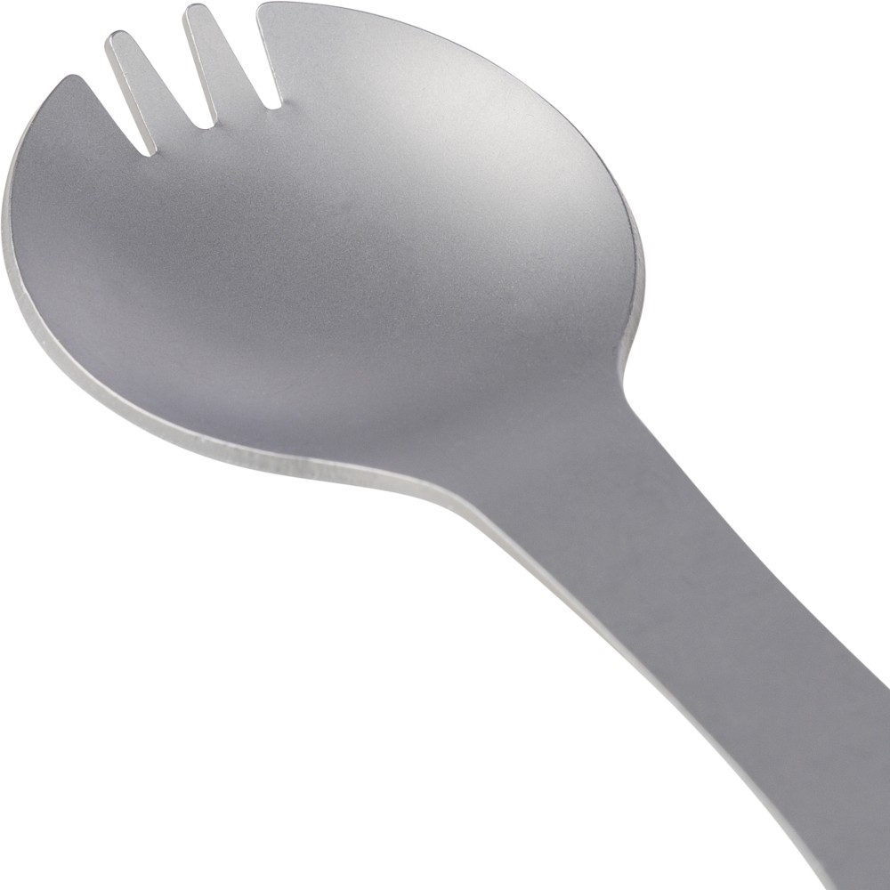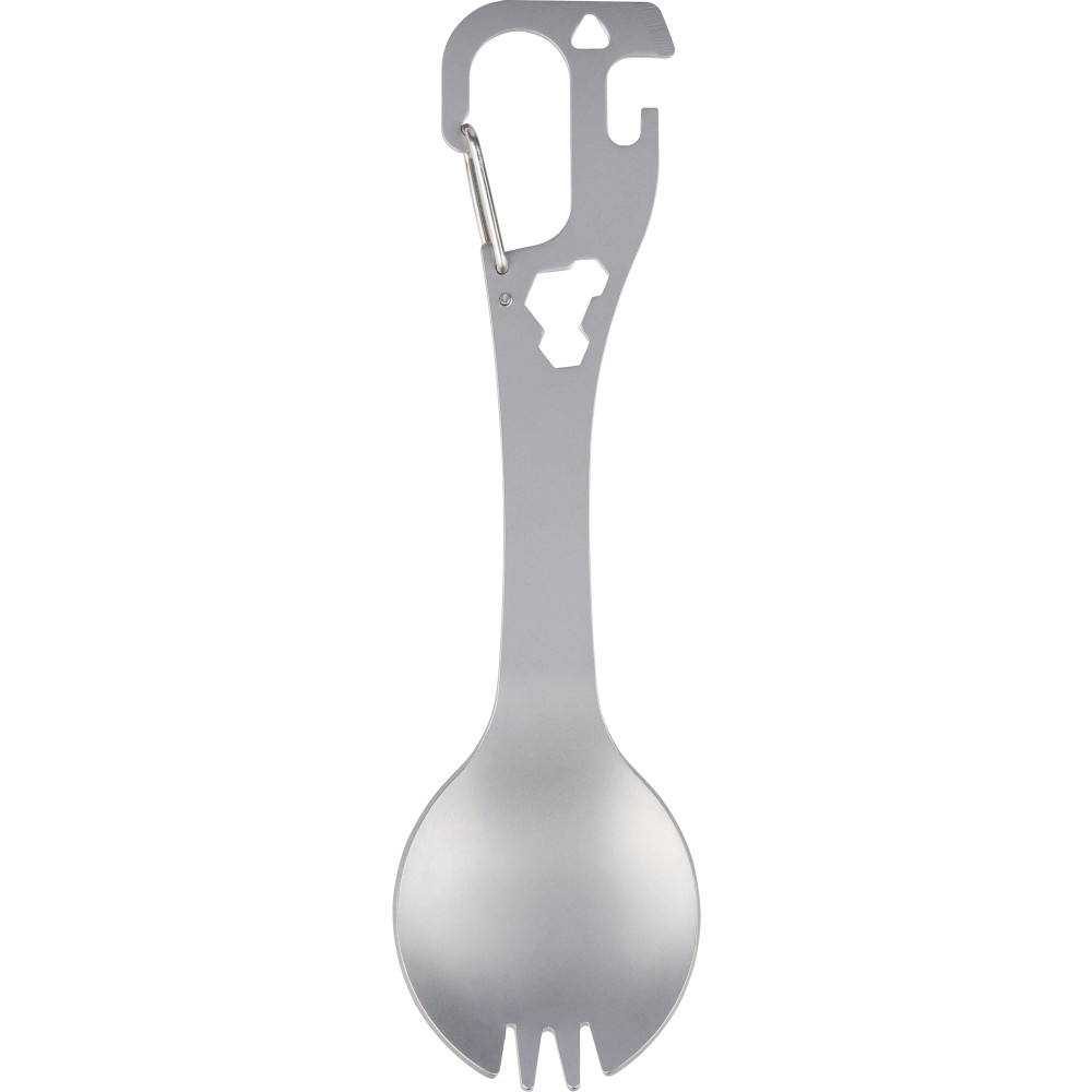 Stainless steel spork with integrated fork and spoon, flat screwdriver, bottle and can opener, and three hex keys in the body. Includes a carabiner clip. Packed per piece in a paper bag.