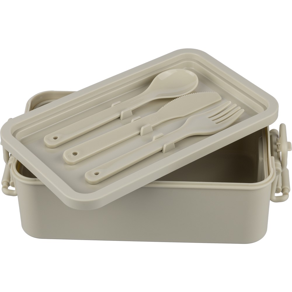 PP two-layer lunchbox with clip closure and PP lid. Features a smaller bottom compartment that stacks into the top to save space. Includes intermediate layer with 3-piece cutlery set. 2,200 ml capacity. Packed in bulk.
