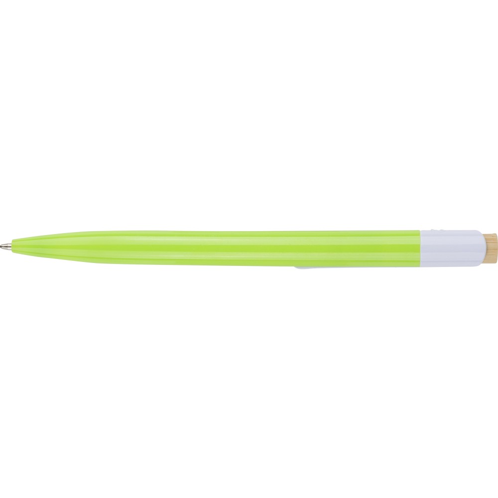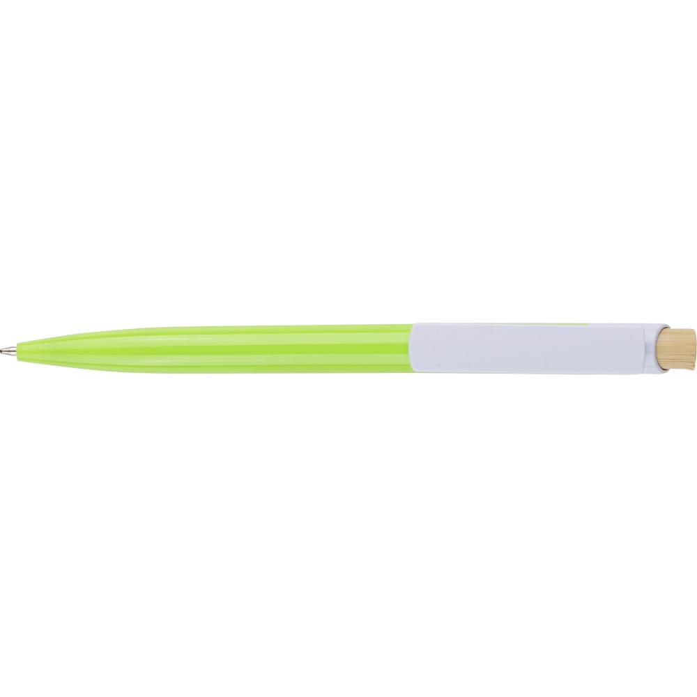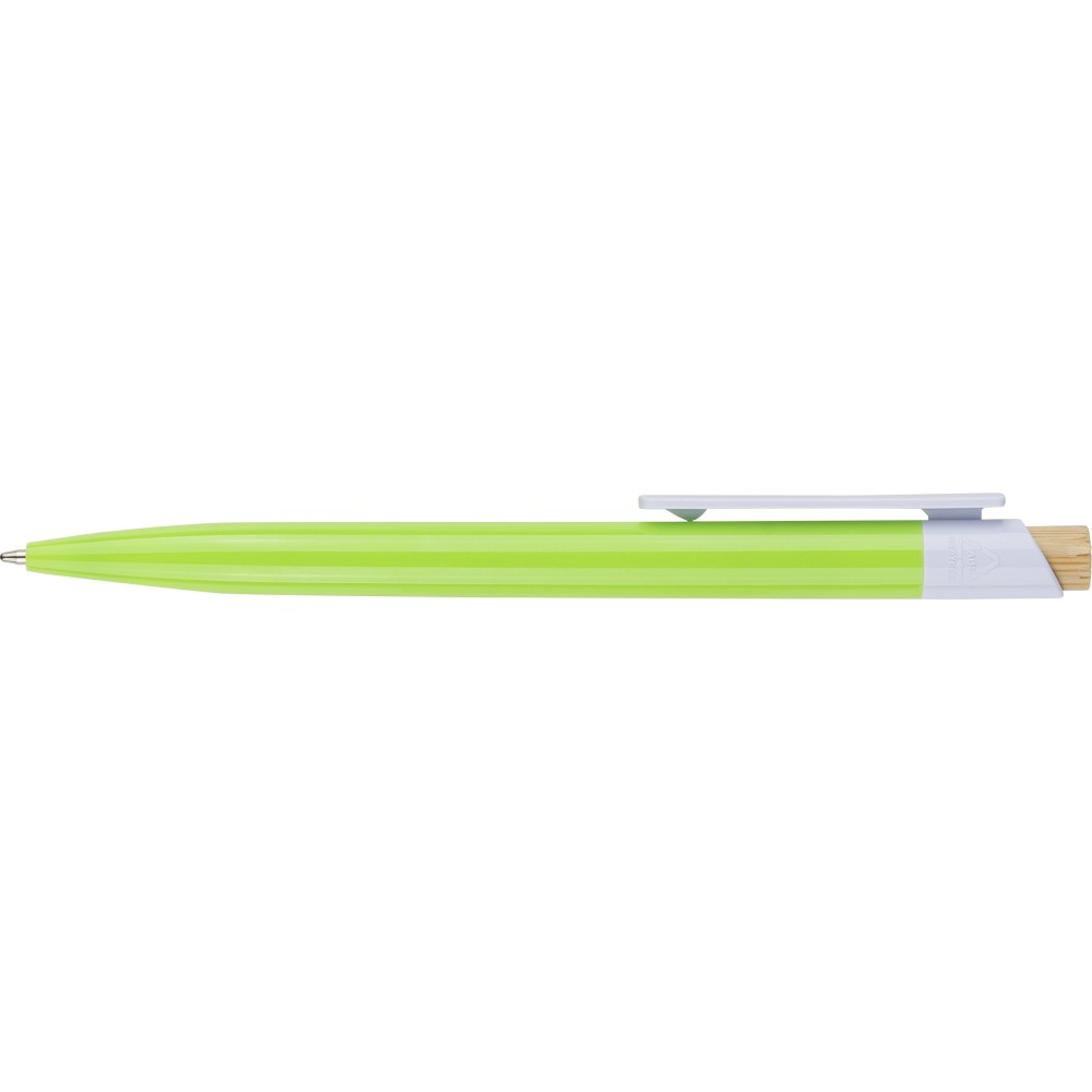 Recycled ABS ballpen with bamboo push button and white clip, suitable for digital printing. Features a recycled logo in the in-mould. Approximate writing length of 600 metres. Blue ink.