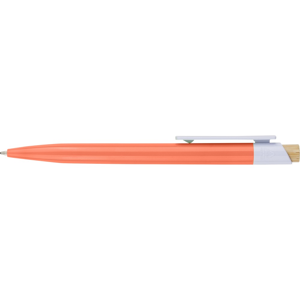 Recycled ABS ballpen with bamboo push button and white clip, suitable for digital printing. Features a recycled logo in the in-mould. Approximate writing length of 600 metres. Blue ink.