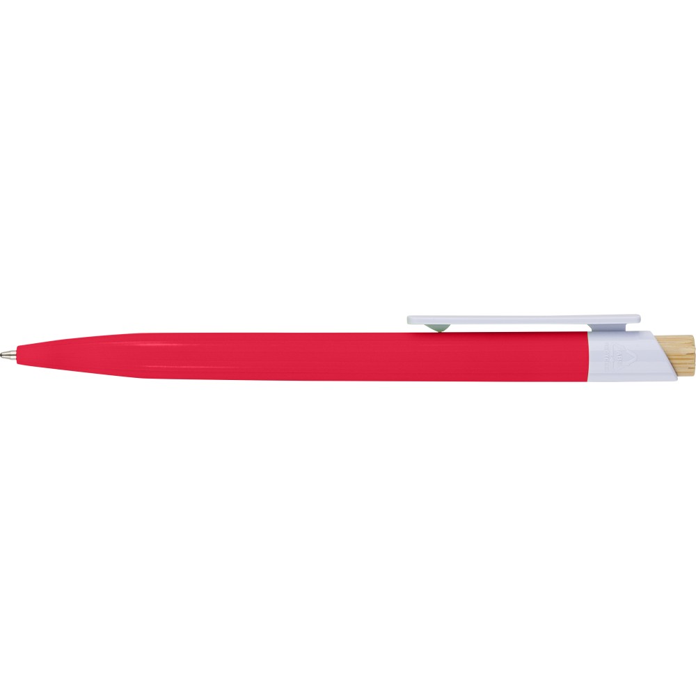 Recycled ABS ballpen with bamboo push button and white clip, suitable for digital printing. Features a recycled logo in the in-mould. Approximate writing length of 600 metres. Blue ink.