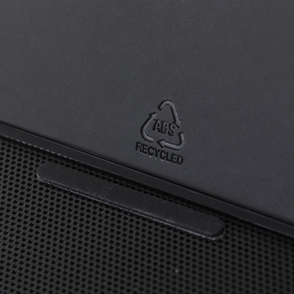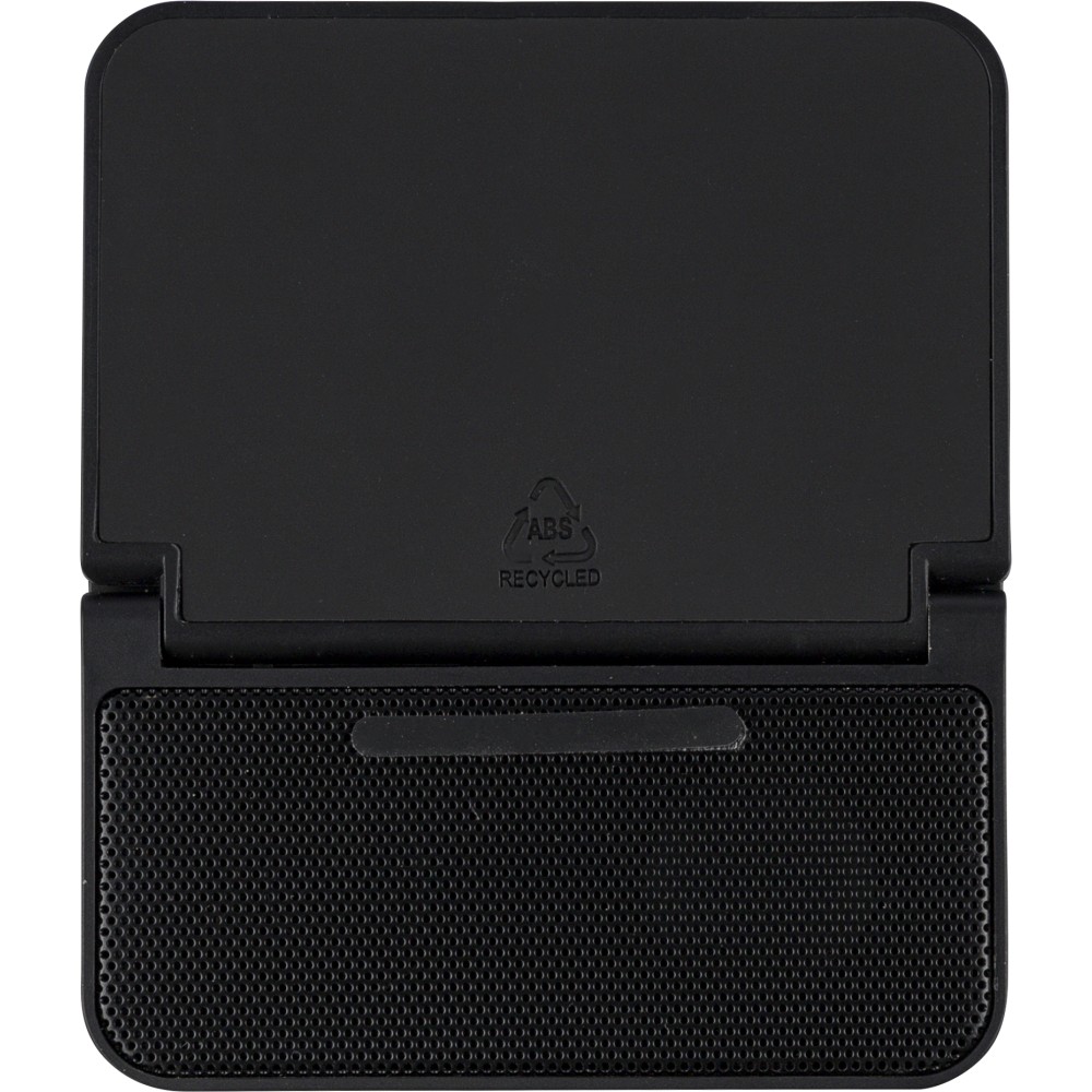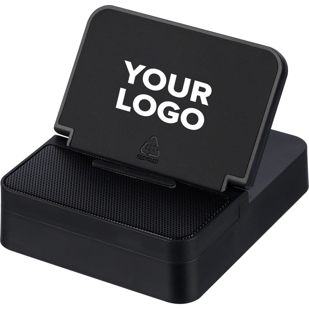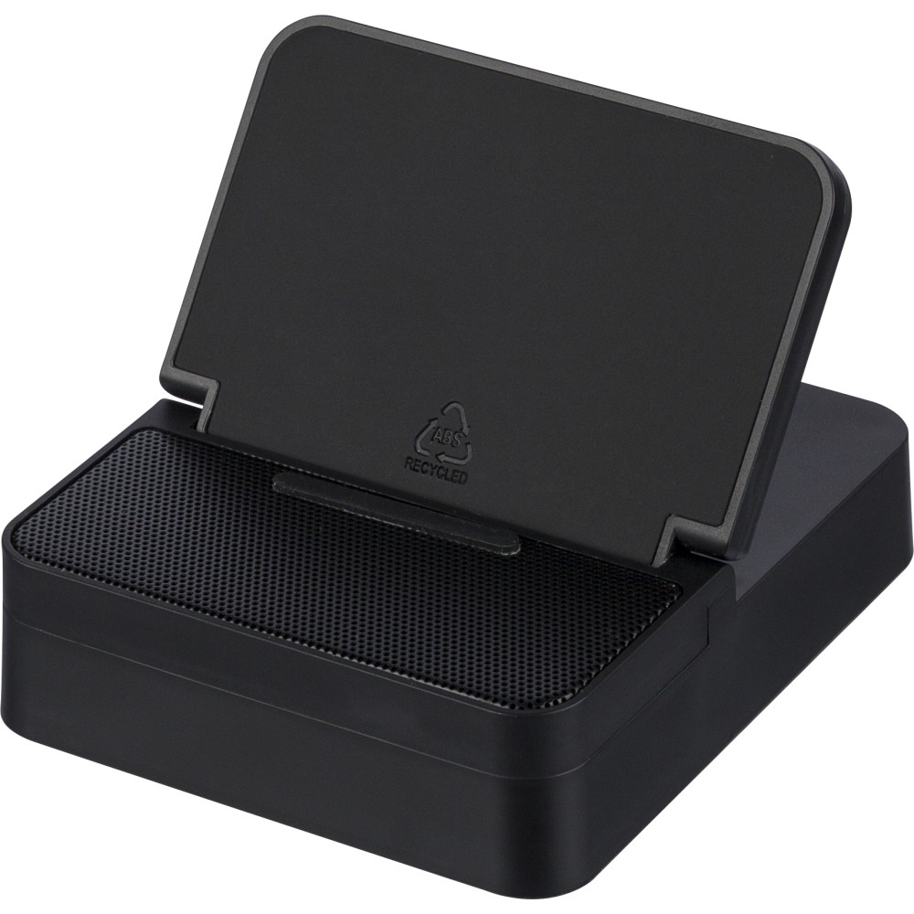 Recycled ABS 3-in-1 cube with 15W wireless charger, 5W speaker, and phone holder. Features wireless tech 5.4, 1200 mAh battery, metal mesh, and recycled PU top. Recycled logo. Packed in brown box.
