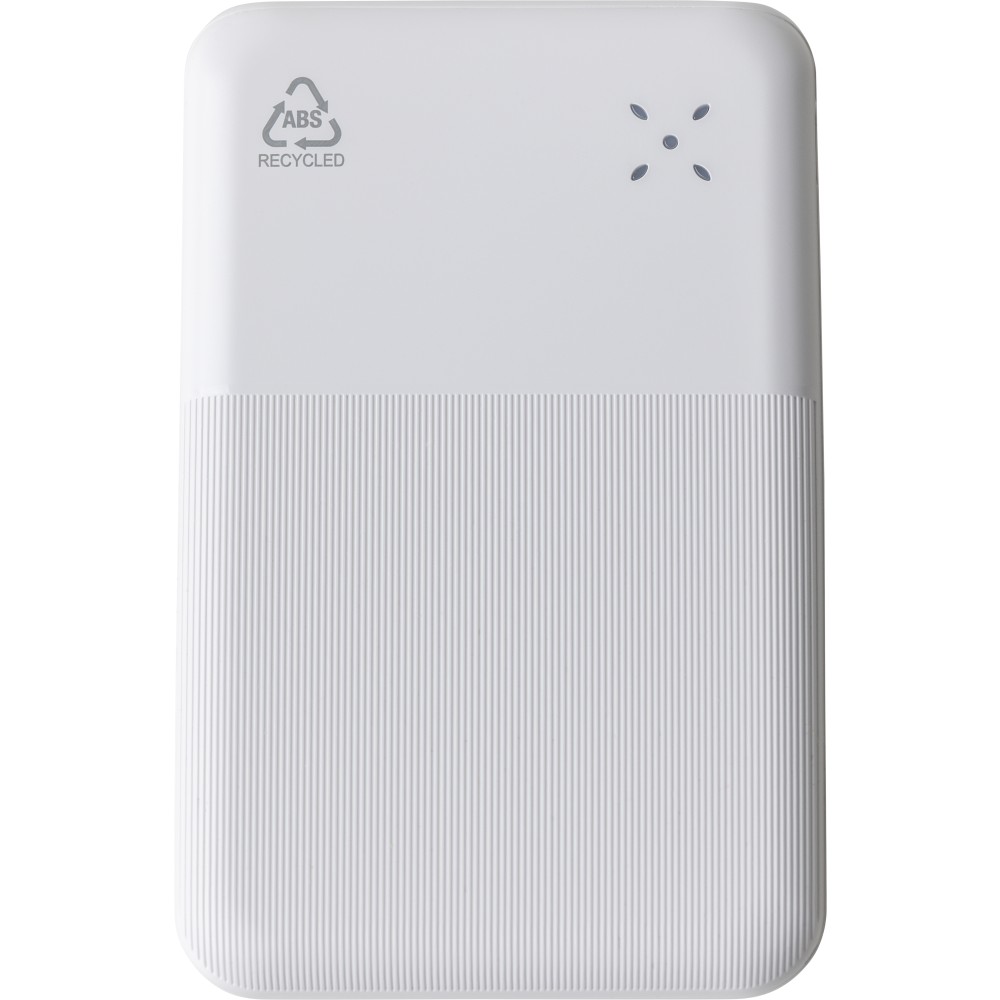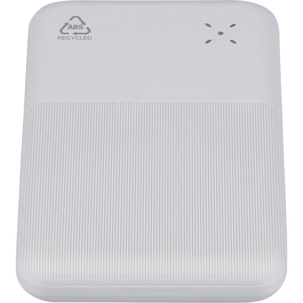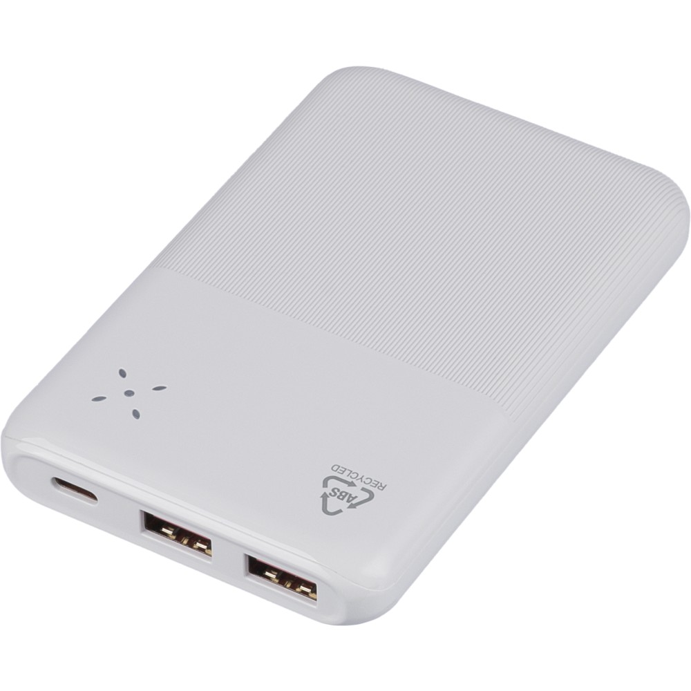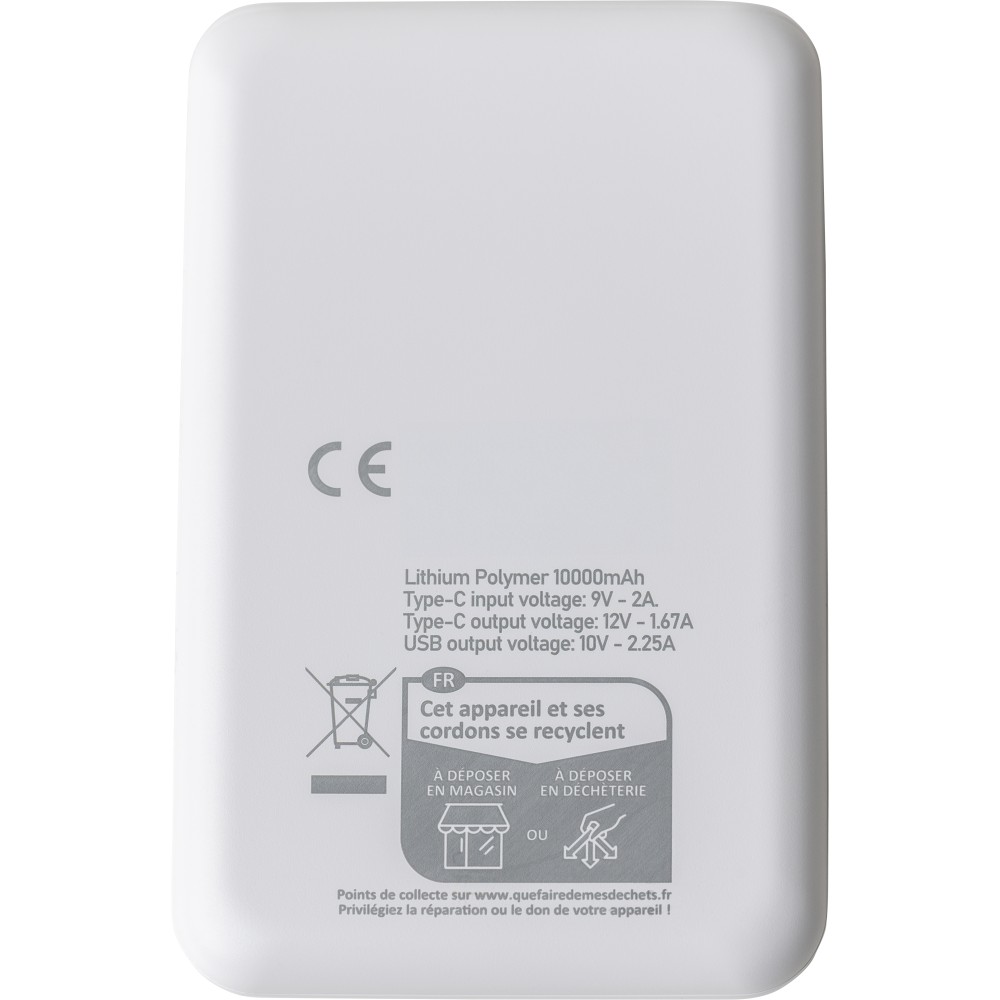 Recycled ABS powerbank (10,000 mAh). 22.5W fast charging. Type-C in/out, Type-A input. Digital display, smooth/textured design. Safety protections. Recycled ABS logo on back. Packed in brown box with tissue paper.