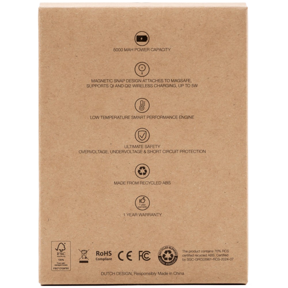 Powercharge Air is an ultra-slim, pocket-sized magnetic wireless powerbank made from recycled ABS. With a 5,000 mAh capacity, it supports 5W magnetic wireless charging compatible with MagSafe, Qi1, and Qi2 standards. Also features a 12W USB-C port for wired charging. Includes a smart safety chip for protection against overcurrent, overdischarge, overcharging, overheating, and short-circuiting. Equipped with LED indicator and smart performance engine. USB-C input: 5V. Wireless output: 5W.
