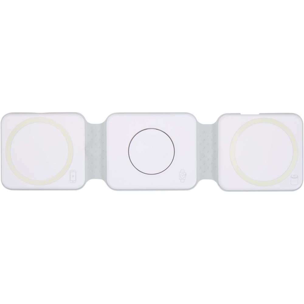 The Armus 3-in-1 wireless charger is made from recycled plastic, and can power a smartphone, AirPods, and iWatch all at once, with up to 15W wireless charging speed. Its foldable, magnetic design lets you place your phone in landscape mode ? perfect for watching while charging. Compatible with all wireless charging phones, including iPhone 12 and newer (or phones with a magnetic ring). Type-C connector included.