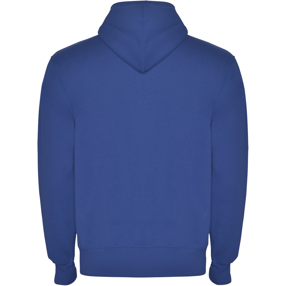 Sweat hooded jacket with high neck and full zip. Ribbed detail in hood and pocket piping. Kangaroo style pocket. 2x2 rib in cuffs and waist. Kids sizes available. Removable label. The model is 184 cm and is wearing size L. Knit of 50% Cotton and 50% Polyester, 280 g/m2.