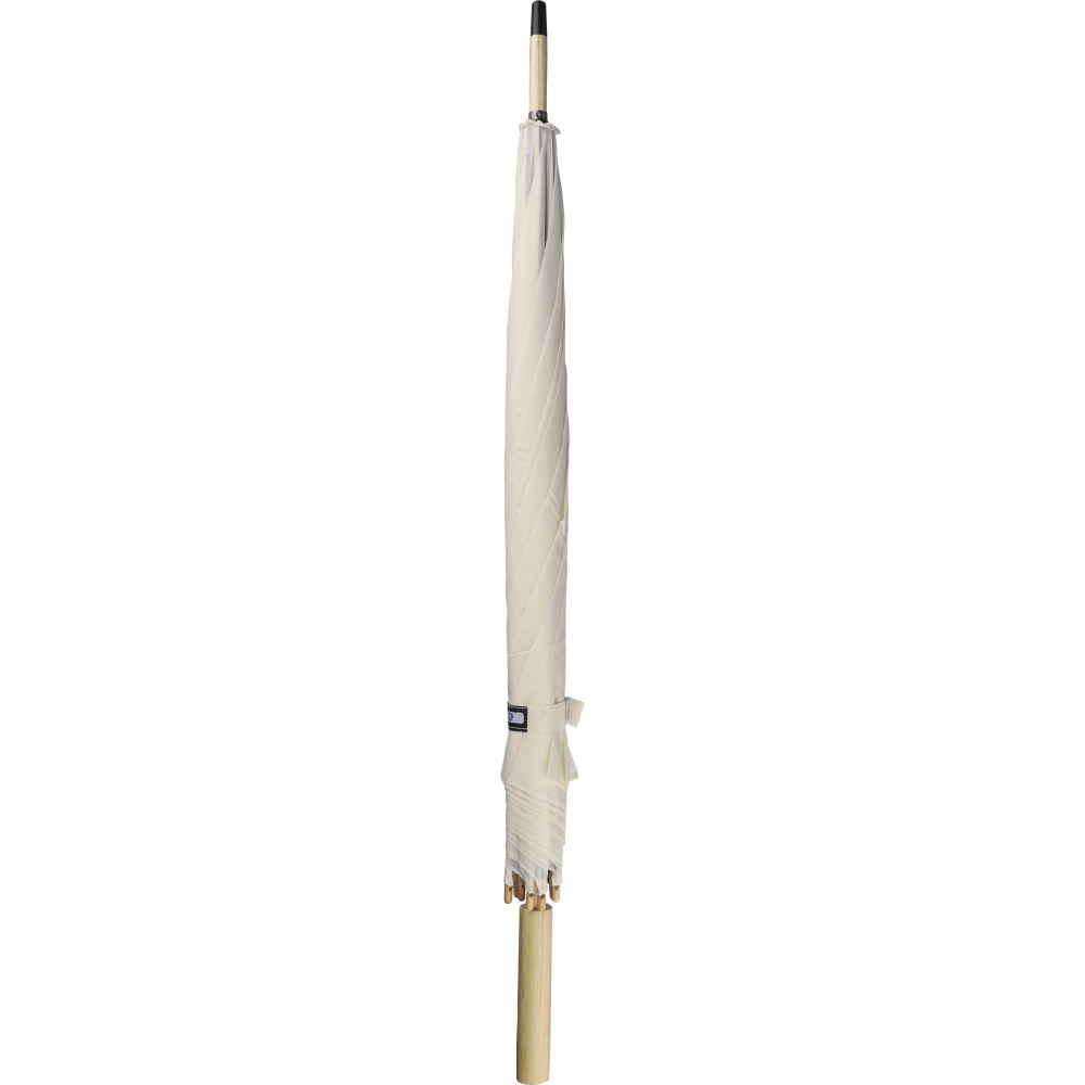 rPET 190T automatic golf umbrella with eight panels and bamboo handle. Bamboo and steel shaft with metal frame. Includes velcro closing strap and rPET label.